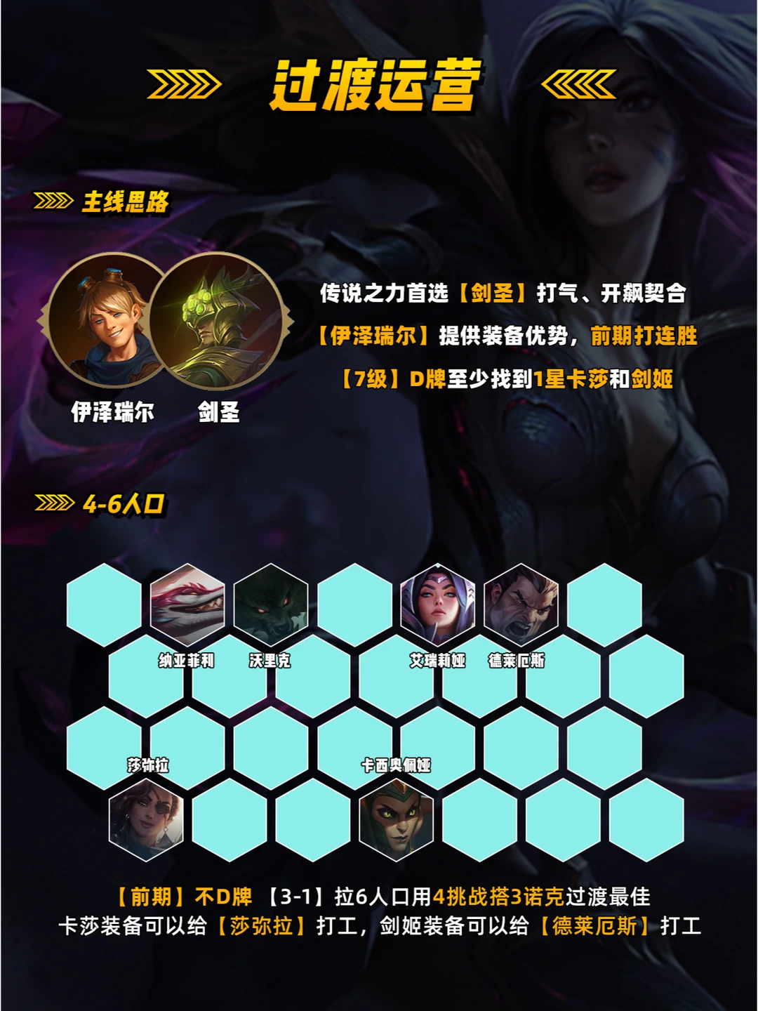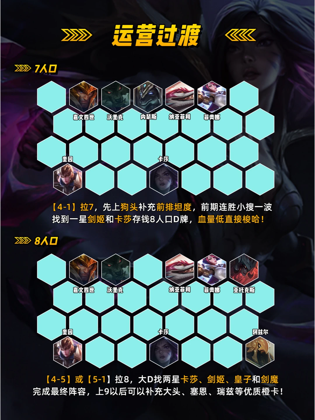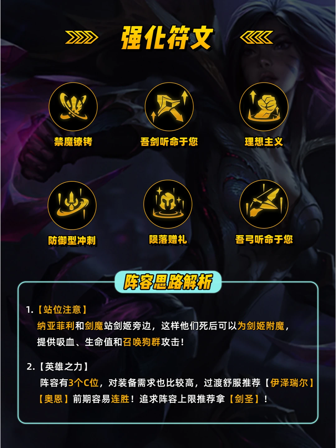 🔥【站位注意】 纳亚菲利和剑魔站剑姬旁边,这样他们死后可以为剑姬附魔提供吸血、生命值和召唤狗群攻击‼️ 🔥【英雄之力】 阵容有3个C位,对装备需求也比较高,过渡舒服推荐【伊泽瑞尔】【奥恩】前期容易连胜!追求阵容上限推荐拿【剑圣】 ‼️