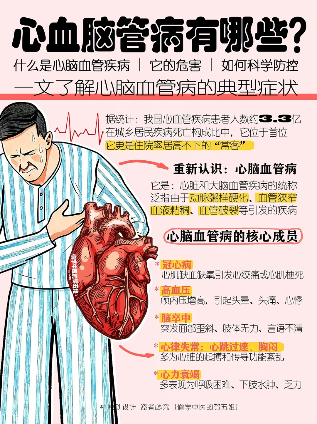 简单说,它是心脏和大脑血管疾病的统称,泛指由于动脉粥样硬化、血管狭窄、血液粘稠等引发的疾病,常见有: