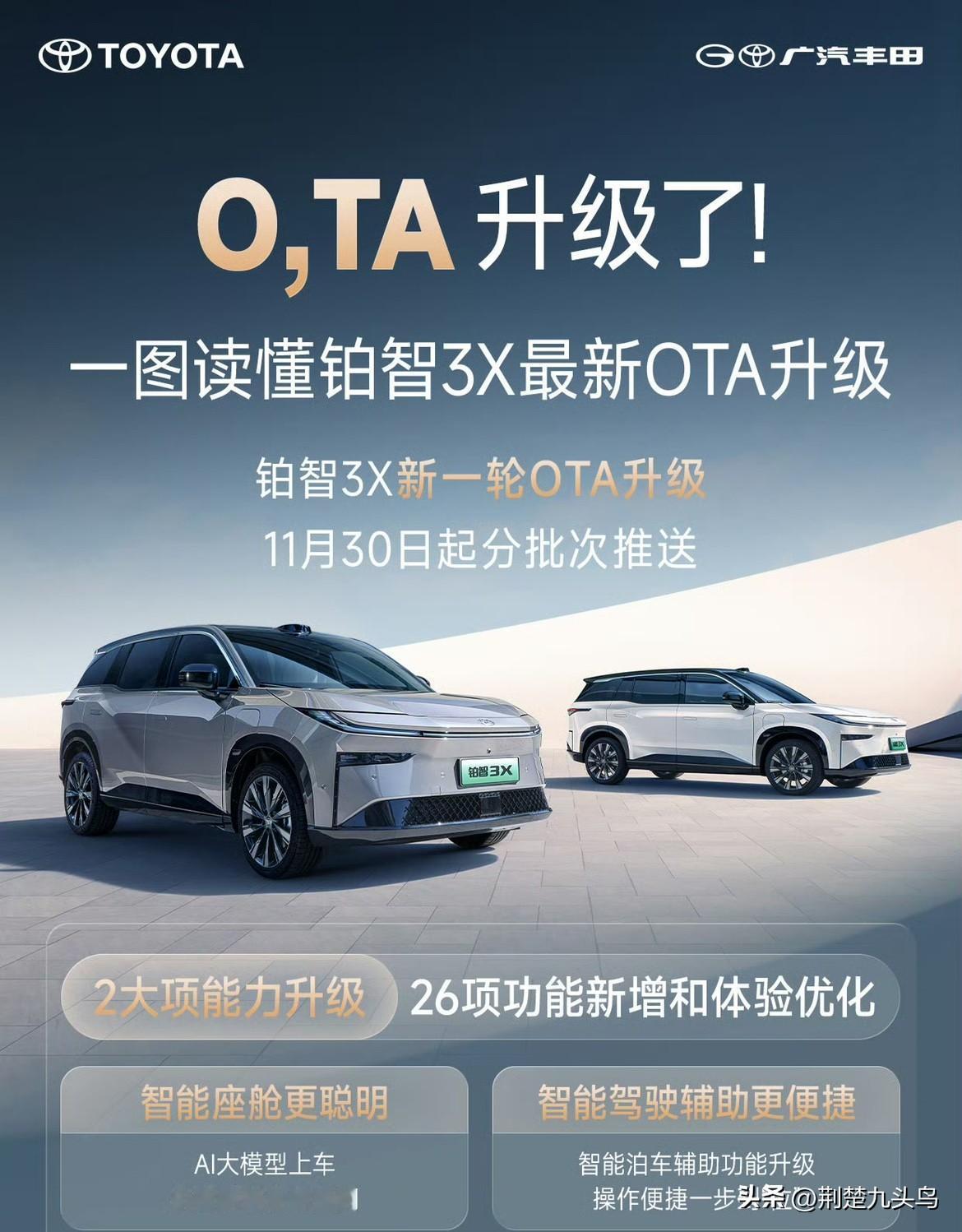 广汽丰田铂智3X年内最大规模OTA在11月30日正式推送,本次升级车头泊出、AI大模型上车、CarPlay等功能,直击用户痛点,广丰在产品体验和迭代能力完全不输给新势力。 广汽丰田听劝,以用户需求为出发,铂智3X OTA功能迭代速度快,同时还具备大厂高品质、厂家兜底服务保障(厂家三担责:电池自燃担责、智能泊车辅助事故担责、电池衰减担责),给到用户更多安心保证,彻底打消对纯电车的购买疑虑。 铂智3X上市即热销,稳坐合资新能源销冠,就是广丰对用户需求的深刻洞察并快速落地的回馈,广丰油电同强,油电同智的转型之路走对了!