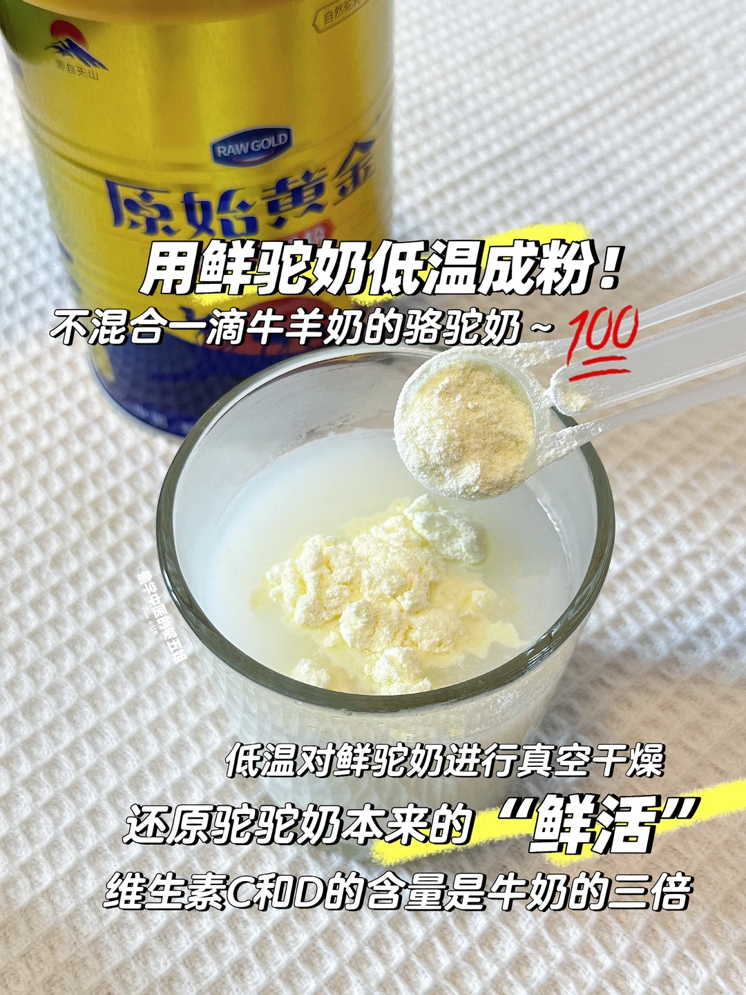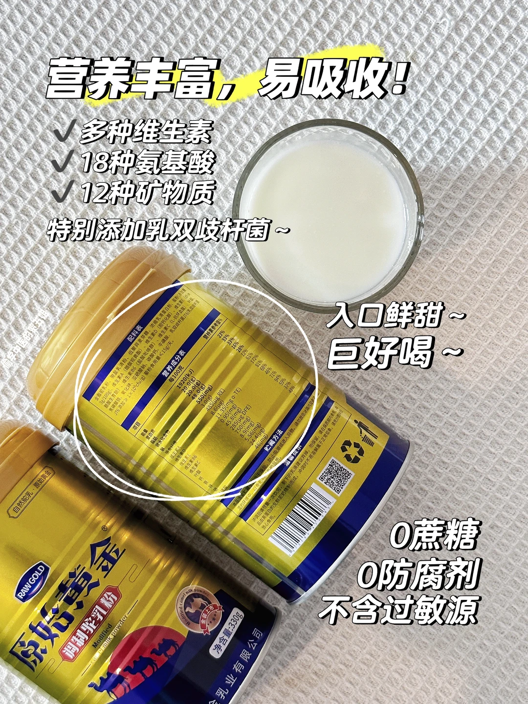 同时,它采用低温锁鲜技术,对新鲜驼奶进行真空干燥,还原了驼奶本身的鲜活味,锁住更多活性营养~还特别添加了乳双歧杆菌,提高肠道有益菌,让营养更易吸收[赞R][赞R]