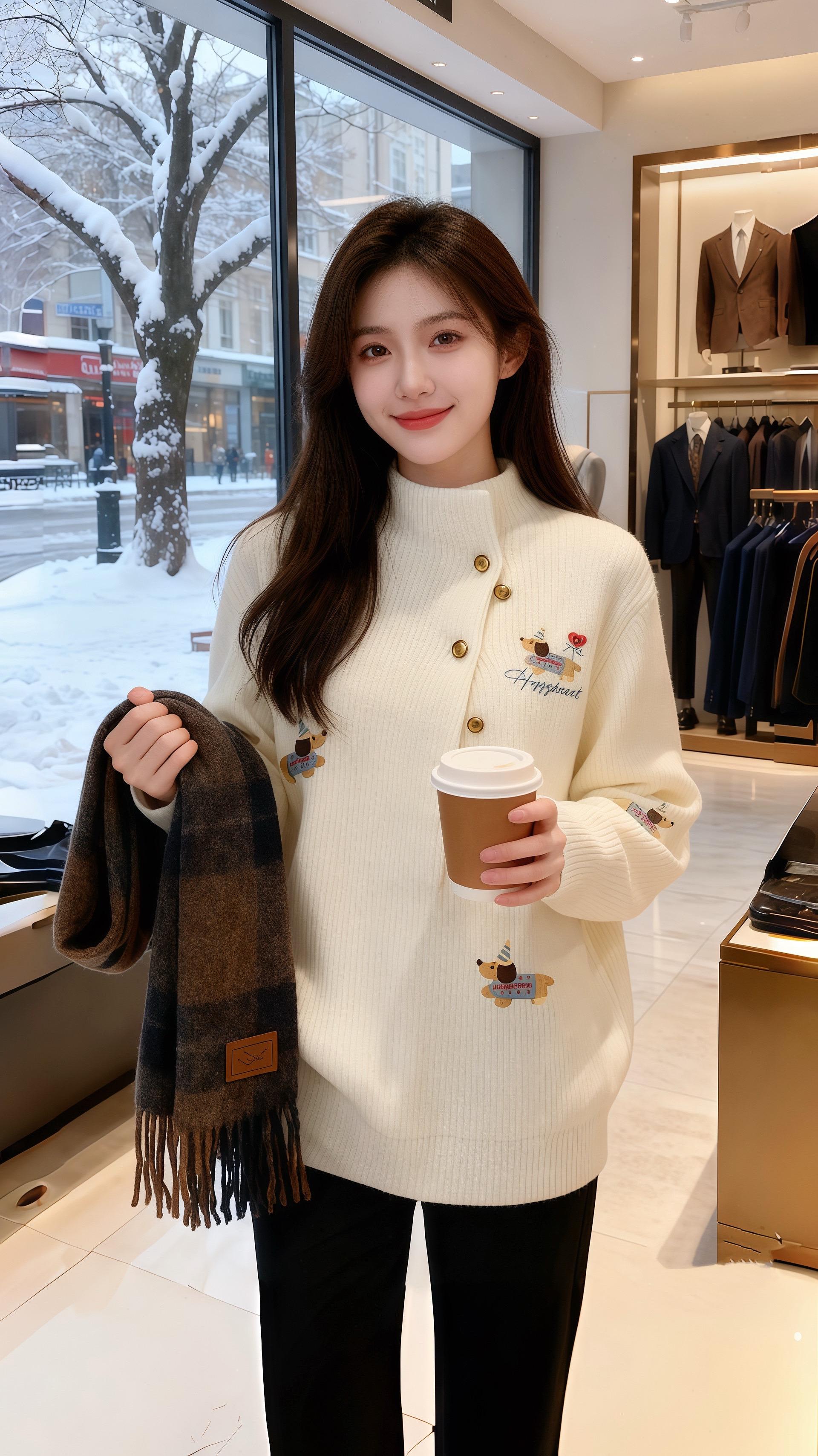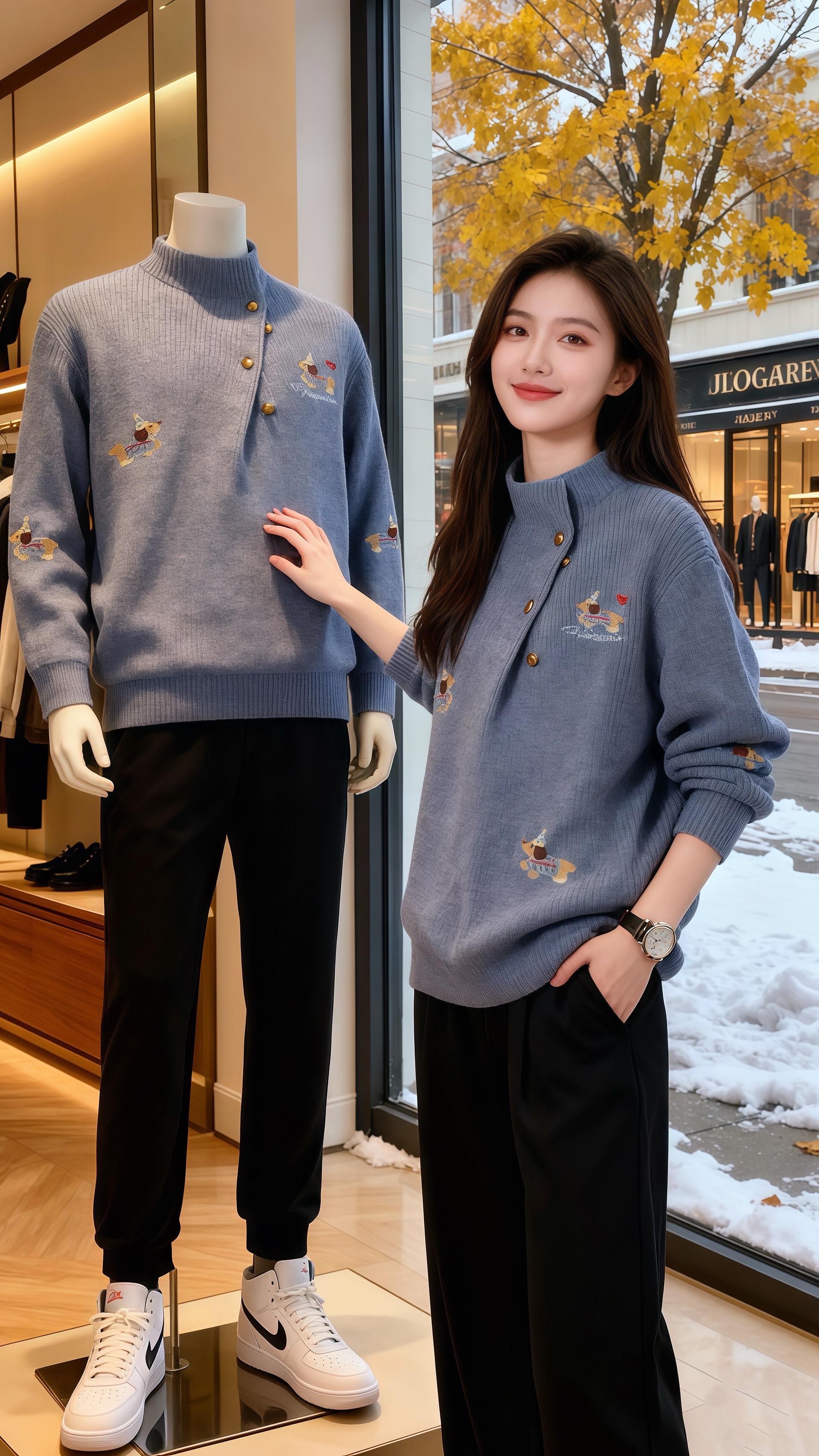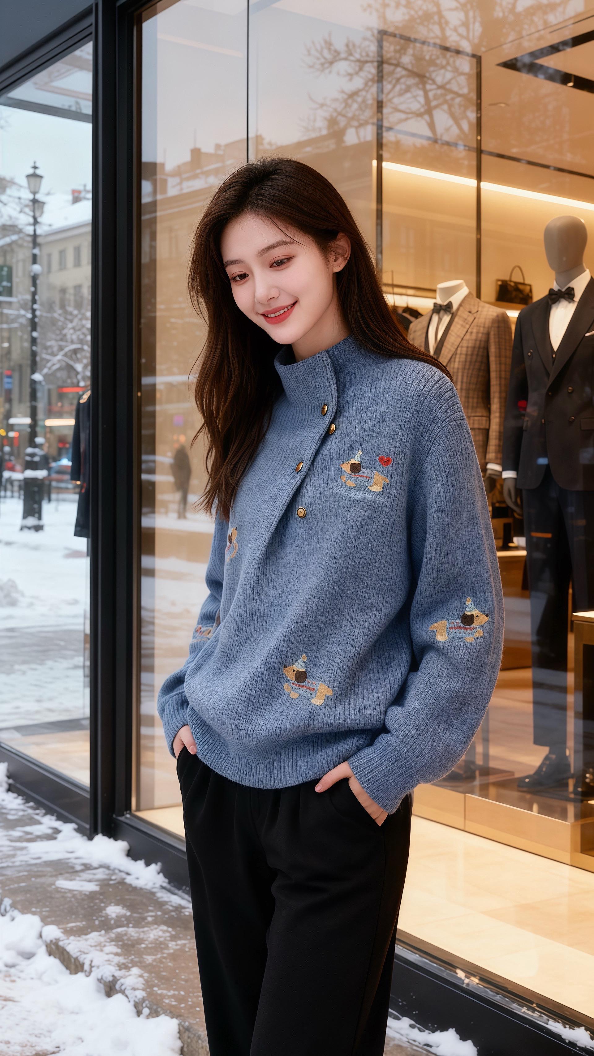 雪落满街的午后,他在男装店等定制大衣,抬眼撞进她浅蓝毛衣的软调里。雾蓝针织的纹理裹着肩线,斜襟金扣衬得脖颈温软,袖上的小狗刺绣像偷藏的甜,配着垂顺的黑裤,把冬寒都揉成了暖。