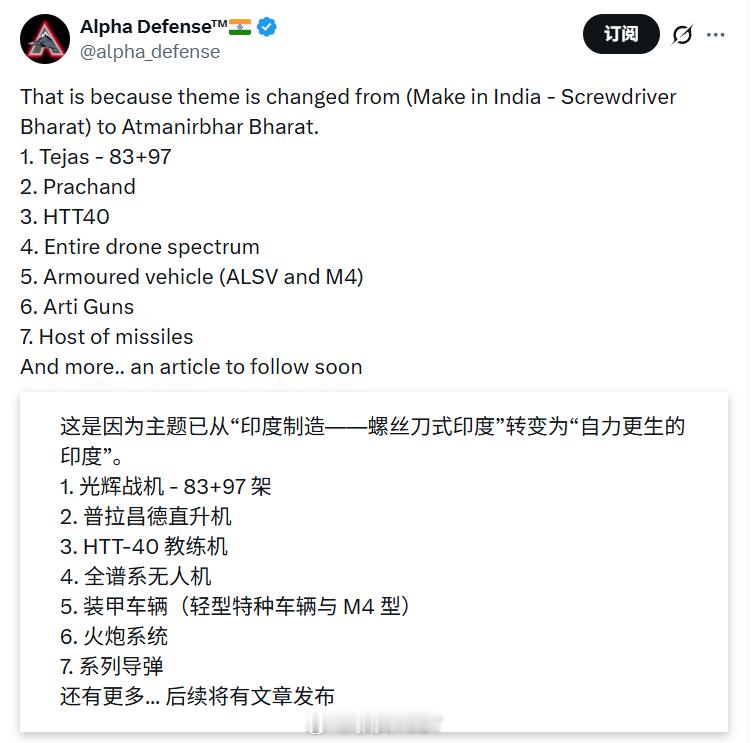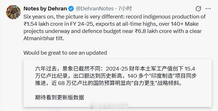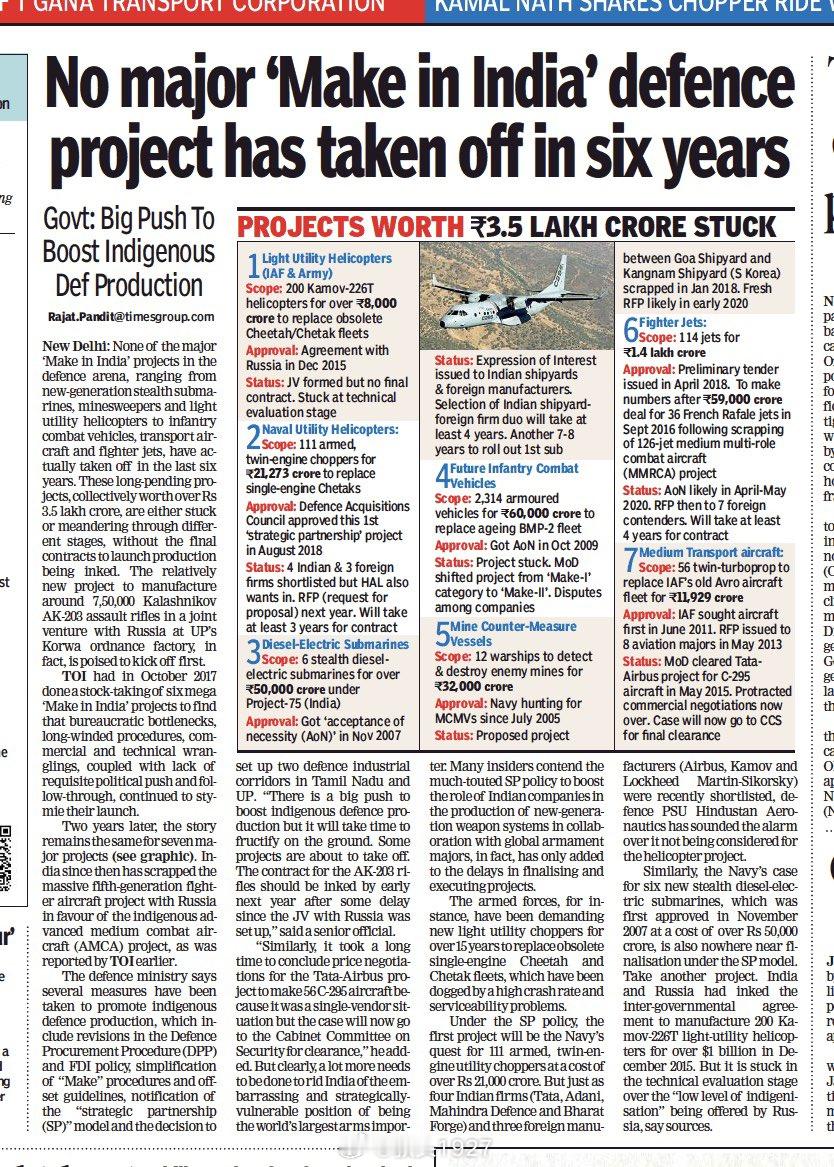 印度时报记者Rajat Pandit 在2019年发表了专题报道《六年来,没有重大'印度制造’国防项目启动》批判莫迪政府高举Make in india大旗却在国防自主化领域毫无建树报道中列举了7大重点项目如今又过去了6年,这位记者对照当初的报道发现:——2021 年签署了价值 2193.5 亿卢比的 56 架 C-295 运输机采购协议—今年 7 月批准了 12 艘反水雷舰的 4400 亿卢比采购意向书。仅此而已!但是印度军事大V们不乐意了:你这公知记者不要抹黑印度军工,你应该好好学习了解我们有多少进步……烽火问鼎计划哈基米