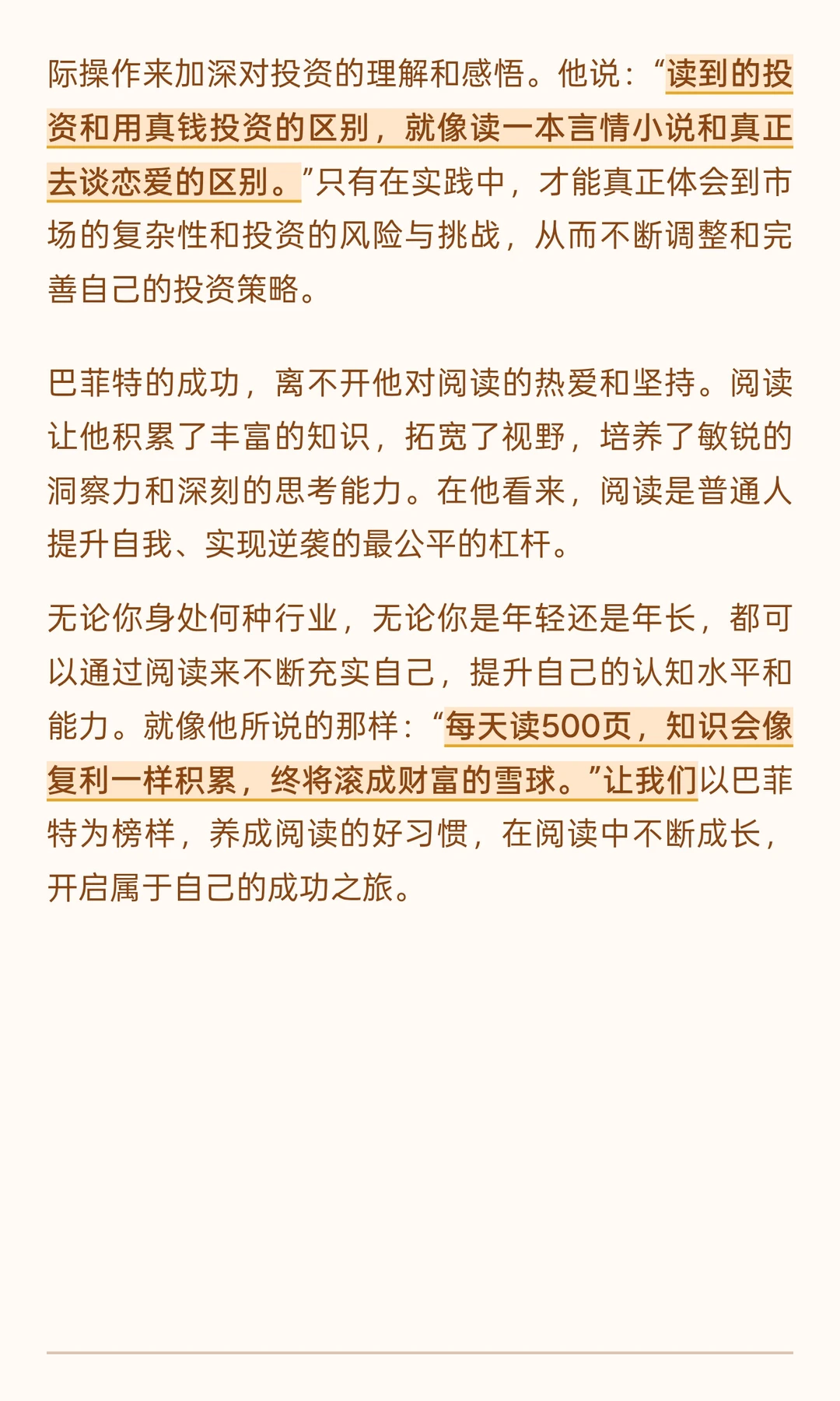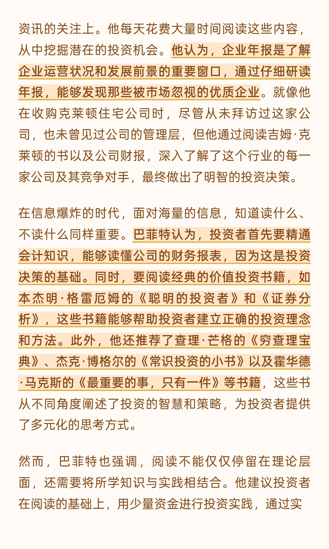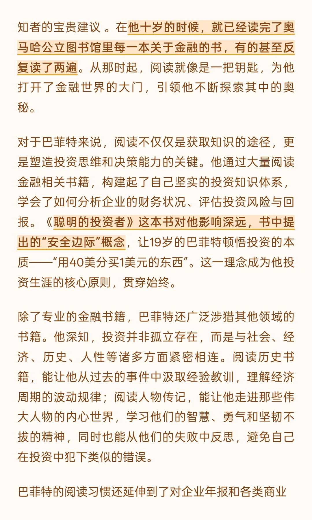 沃伦·巴菲特将阅读视为投资生涯的核心,每天阅读五份报纸和大量杂志,构建了坚实的投资知识体系。 巴菲特曾直言:“我就是喜欢阅读,不停地阅读,我一天大概要阅读五六个小时。”即便如今他的阅读速度不如从前,却依旧每天雷打不动地阅读五份报纸,翻阅相当多的杂志,仔细研读报表和年报,还热衷于阅读人物传记。阅读,早已成为他生活和工作中不可或缺的一部分,如同呼吸一般自然。 推荐经典书籍如《聪明的投资者》和《证券分析》,强调将理论与实践结合,通过阅读和投资实践提升自我,实现逆袭。