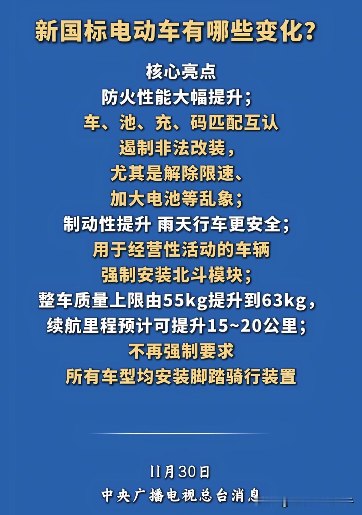 一个好消息,一个坏消息! 好消息:新国标电动车更安全耐用了, 坏消息:但价格也比旧国标贵得多,据人民日报报道,12月1日起,所有旧国标的电动车将全面停售,而且也只有符合新国标的才能登记上牌,这意味着以后买到了也不能合法上路使用。 对比了一下两者的差距,新国标电动车不能超过25码,安装了防篡改设备,如果超速电机将会停转。 车身的用料也升级了,要求使用阻燃材料,降低塑料件的使用,所以车会更重。 总结下来就是速度变慢了,但车的质量更好了,不过价格也贵了,现在新国标电动车大概在4000元左右。 看了不少网友评论,认为电动车最大的优点就是便宜实用,新国标一出来还不如骑自行车算了,速度还更快。 对此,您怎么看呢?