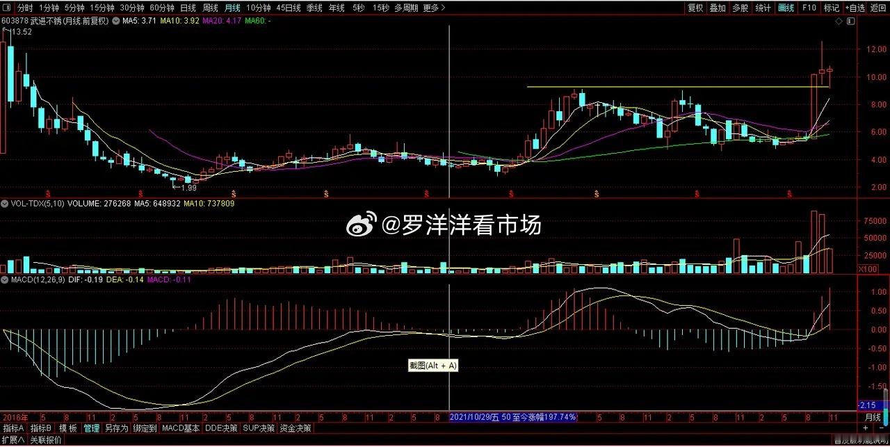 武进不锈:一剑封喉倍量涨停! 飘龙飞天!11月30日,复盘武进不锈,上周五,高开高走,站稳分时均线飘飘荡荡,午后开盘涨停。后市如何?简单分析一下:1.左峰第一波首板涨停突破平台,沿着5日均线上涨,直接翻倍。见顶开跌1个月见底,获得60日均线和左方高量柱双重支撑回升,涨停开启二波行情。2.顶底互换,远期左峰。第二波行情要突破左峰。3.周五涨停很有特点,飘龙形态,放出3倍量,主力强悍!开始拉升行情。月线图,双剑霸天地,看涨形态。日周月图,趋势向上,预判震荡上行。仅仅作技术分析,不为荐股静待市场验证。若有试盘操作,风险自负。