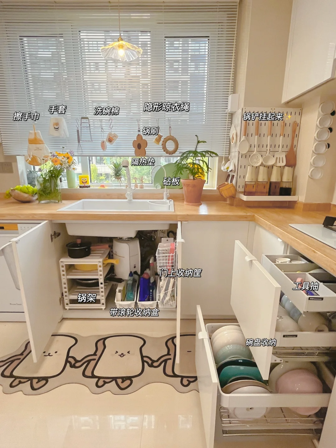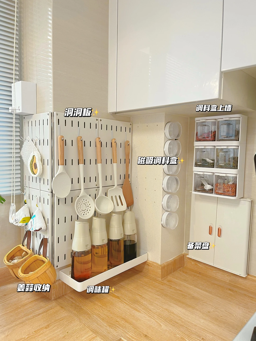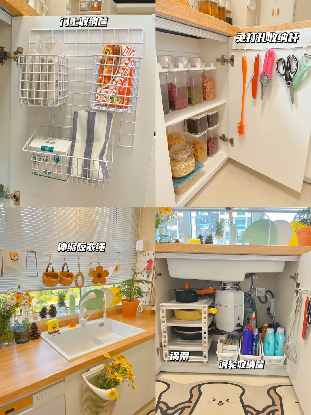 ✔️厨房收纳:厨房收纳我一直遵循能挂都挂的原则洞洞板、磁吸调料盒、备菜盘、门板收纳筐、收纳杆,甚至晾衣绳都用上了,连我妈都说这些稀奇古怪的小东西,还真的挺好用!