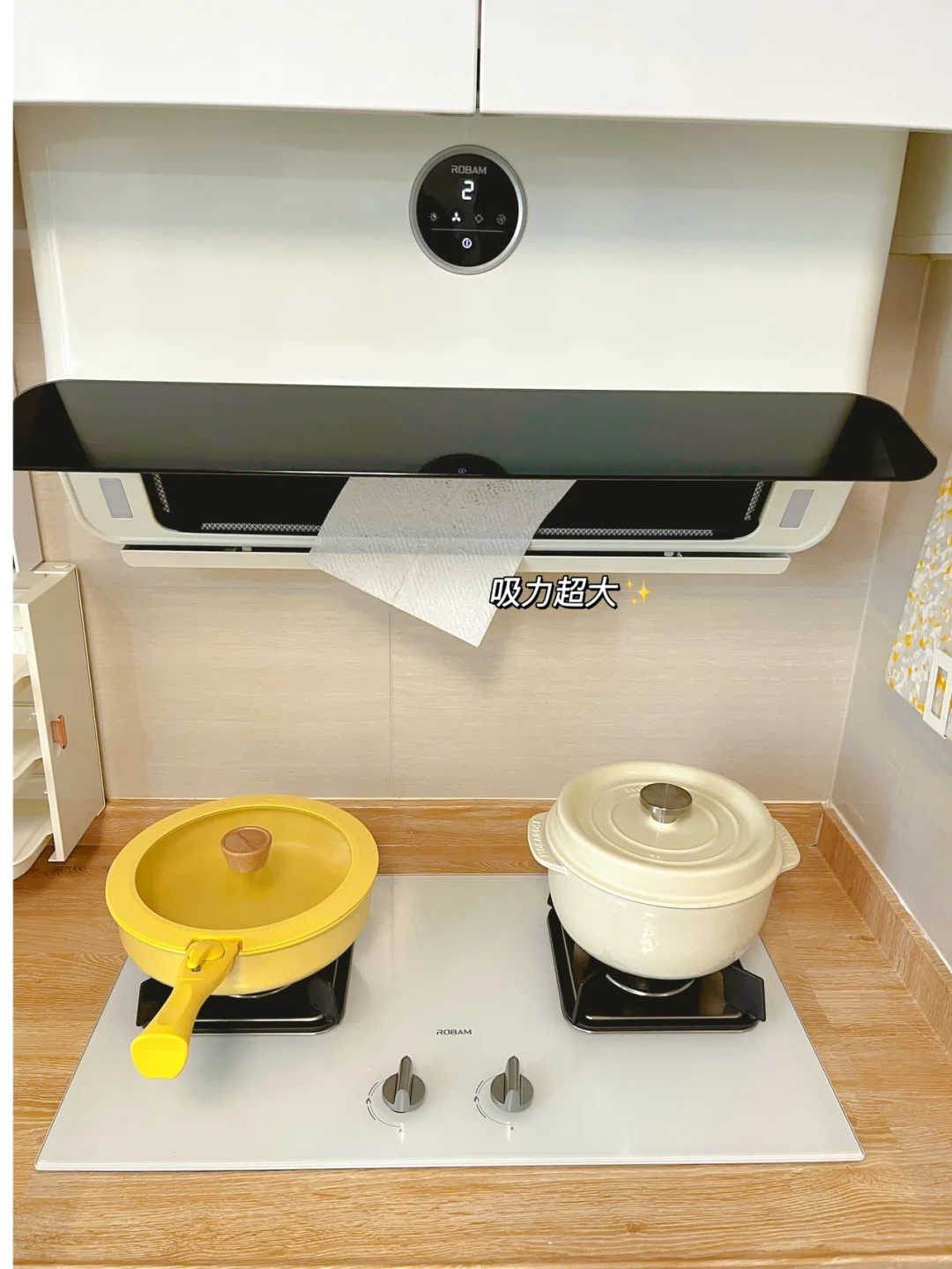 ✨ 另外吸力还很大,它工作时进烟口距离台面近,油烟一出来就会被吸走,风量每分钟有23立方,配合变频电机,风压高达950Pa,东西全部挂起来的厨房也不用担心到处油腻腻的了。