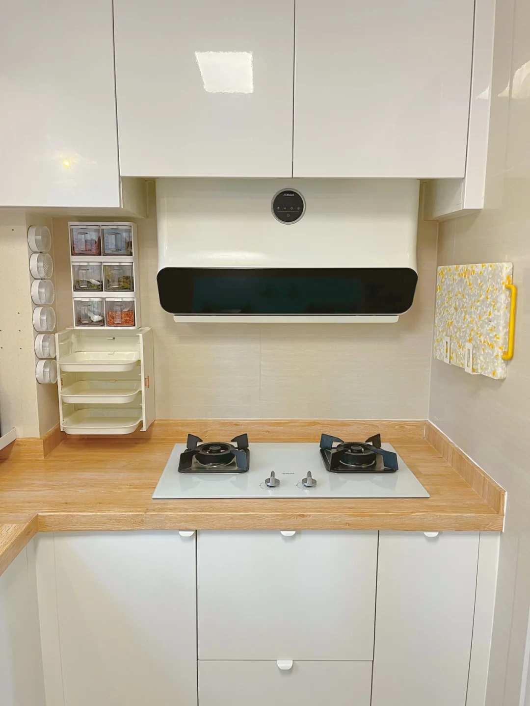 东西全部挂起来以后,其实对油烟机的要求很高,一定要选择吸力大的,要不然时间一长肯定满是油渍,同时还得颜值在线!我找了好久才发现了这台奶油色高颜值的老板超薄近吸油烟机,装好后真的击中我的心了,我觉得这款油烟机的颜值应该可以挑战全网了,搭配上他们家的白色钢化玻璃面板灶具,颜值不要太高,哈哈~