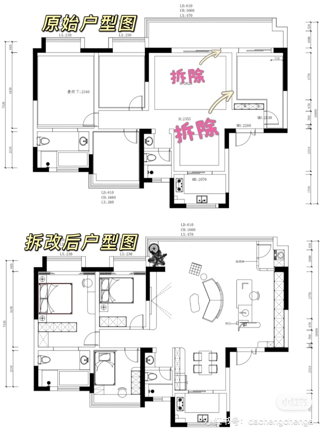 1⃣️砸掉一个房间,客厅改成大横厅,开间从不到5m扩大到8m!