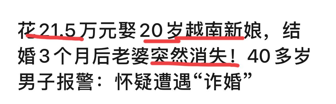 男子花钱娶越南女孩,没想到人去屋空! 据媒体报道,事发杭州,40多岁男子花了20几万, 经人介绍娶了20多岁的越南女孩为妻, 但不久女孩消失了! 怎么说呢, 这种一看就是骗婚吧,没想到至今也有人相信这种婚姻… 今天是越南已不是几十年前那种极端贫困的地方了。40多岁自身条件又不好,想花20万就找个那么年轻的女孩,是不太可能的了, 如果能找到,那只会遇见这种诈骗的了! 越南女嫁中国 越南媳妇骗局 杭州