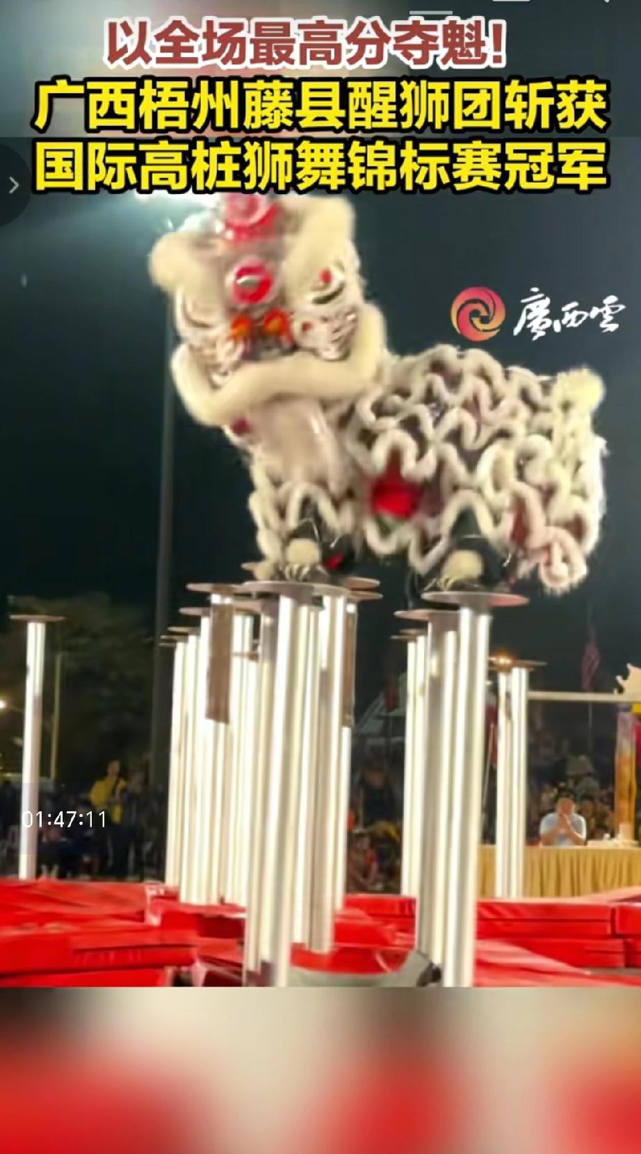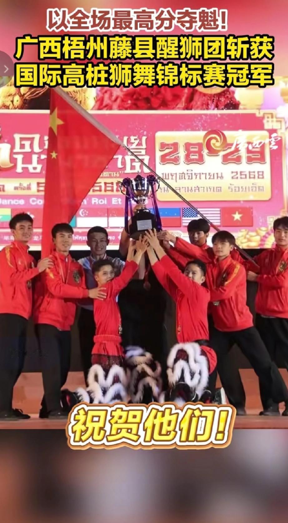 祝贺广西梧州藤县醒狮团在国际赛事中夺冠2025年11月29日,在泰国黎逸举办的国际高桩狮舞锦标赛决赛上,广西梧州藤县醒狮团凭借精湛的技艺,在高桩上完成一系列高难度动作,以全场最高分9.65分斩获冠军。(来源于@广西云)
