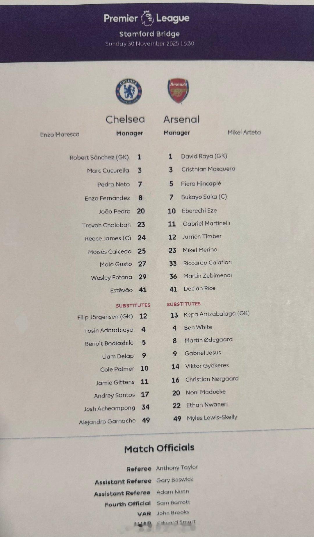 【阿森纳主力中卫缺阵】切尔西vs阿森纳,枪手一对主力中卫,加布里埃尔与萨利巴同时因伤缺阵。阿森纳官方确认,萨利巴在训练中撞伤,缺阵这场榜首大战,热苏斯和哲凯赖什伤愈,进入替补名单。本场比赛,枪手的首发中卫是莫斯克拉和因卡皮耶。PS:萨利巴有随队前往斯坦福桥。