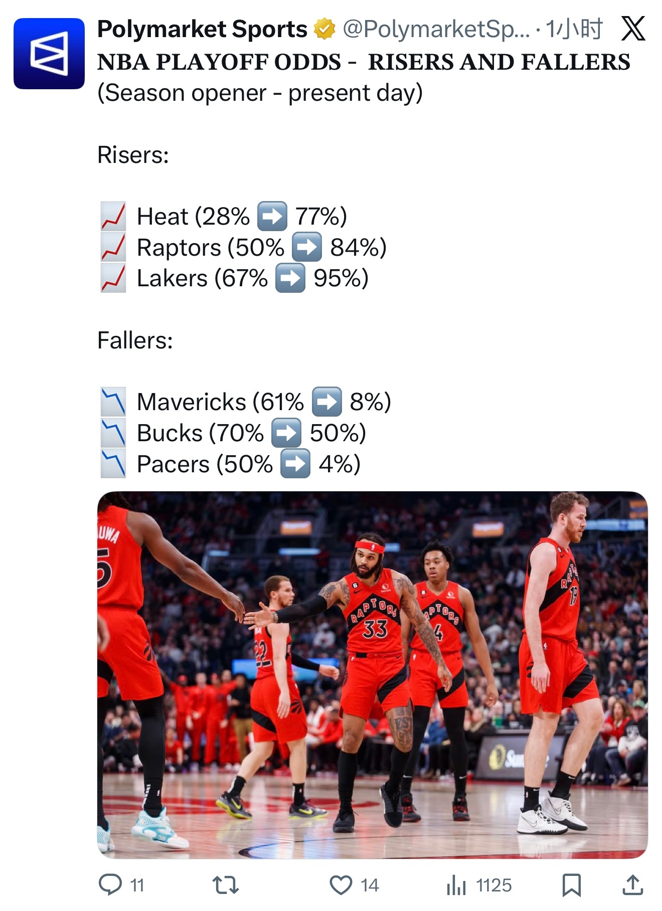 预测机构更新了各队揭幕战之前和至今打进季后赛的概率对比:湖人 67%涨到95%热火 28%涨到77%猛龙 50%涨到84%独行侠 61%跌至8%雄鹿 70%跌至50%步行者 50%跌至4%