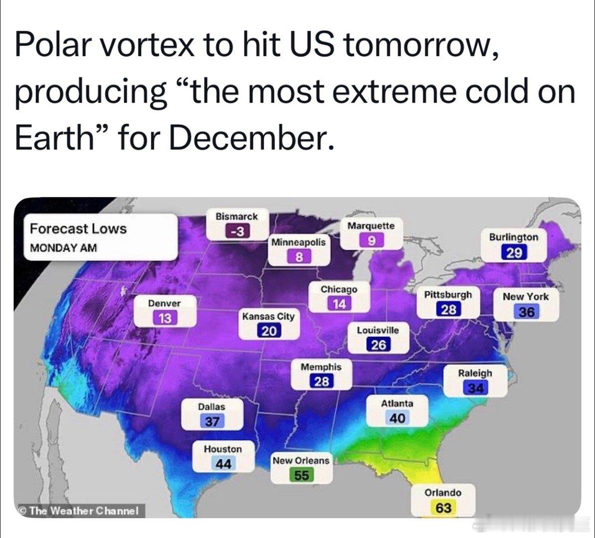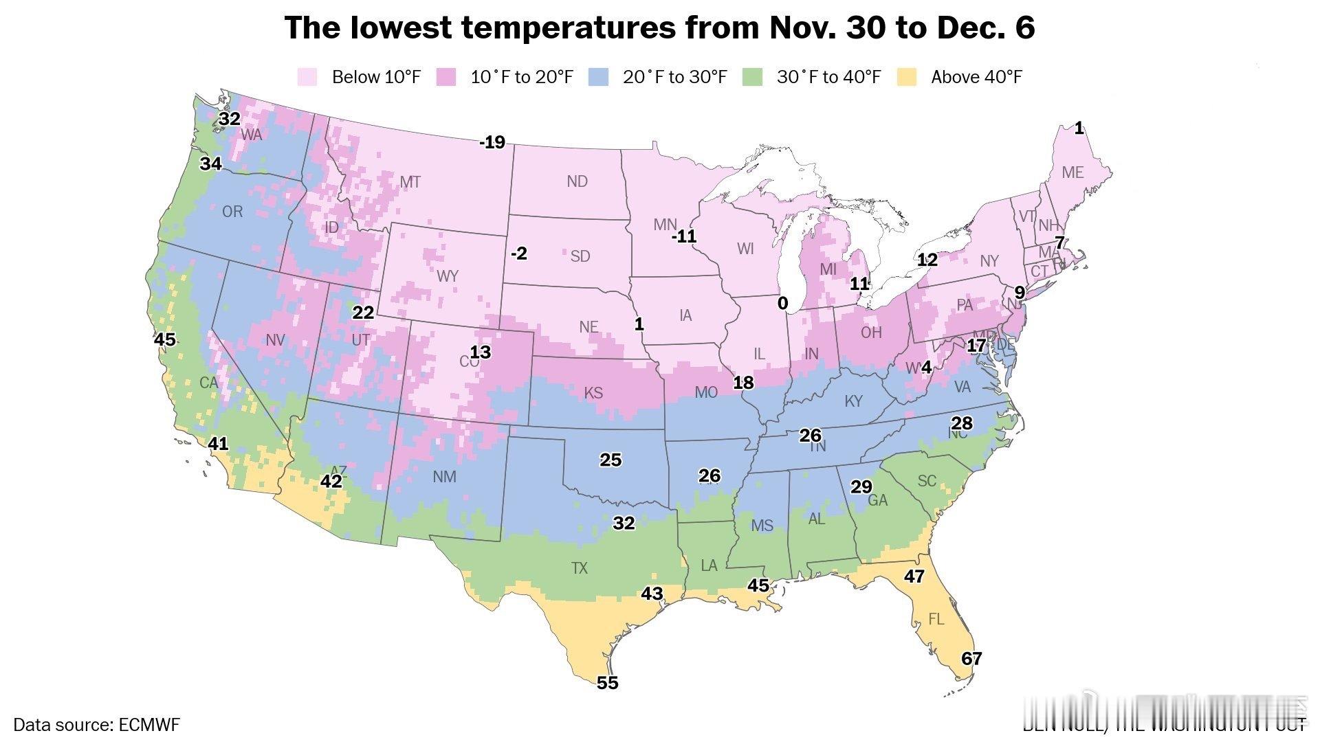 十二月第一周,美国大部会降温,有些地区可能创下同期低温纪录(图中为华氏度,华氏3