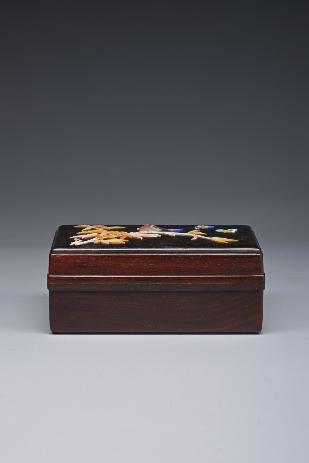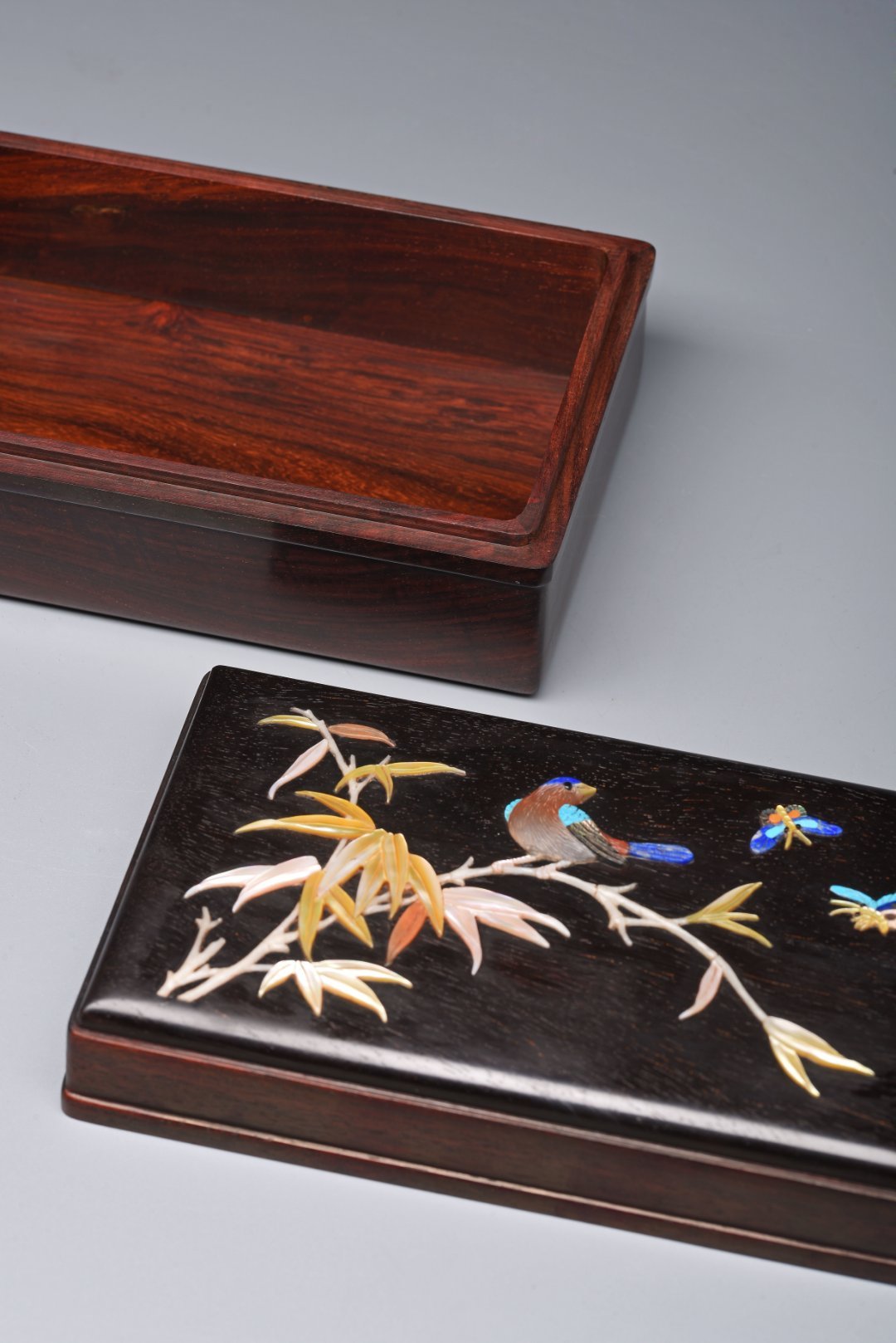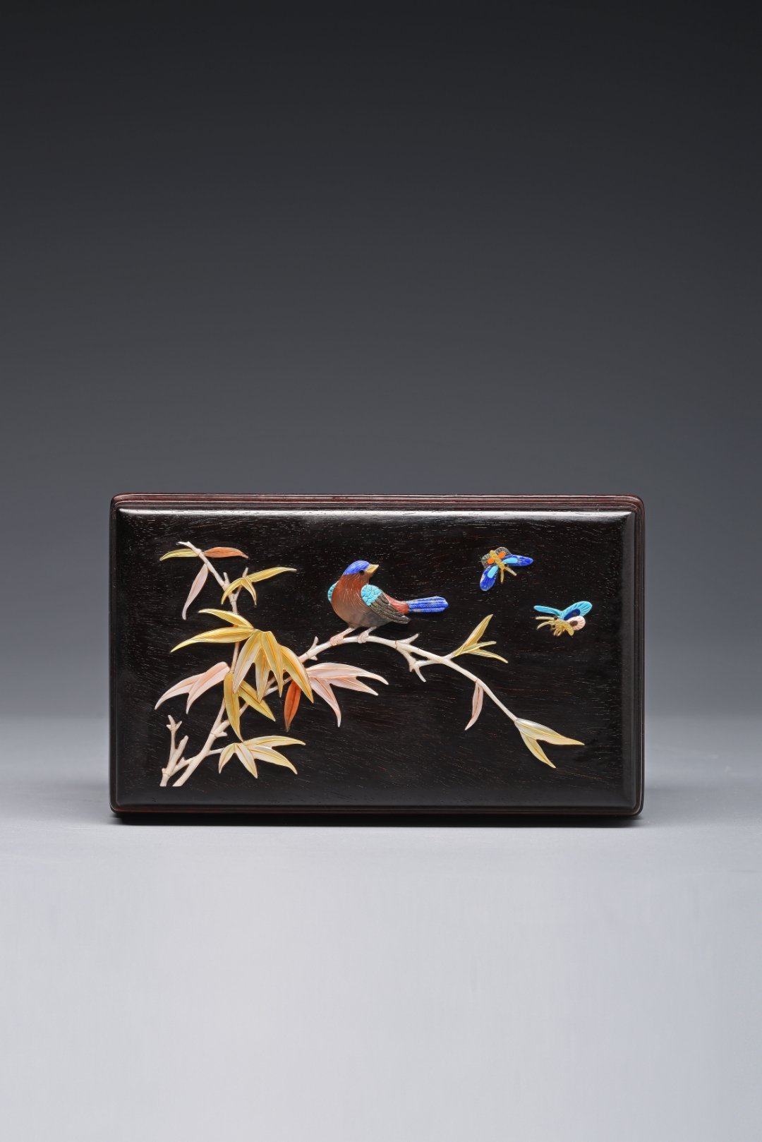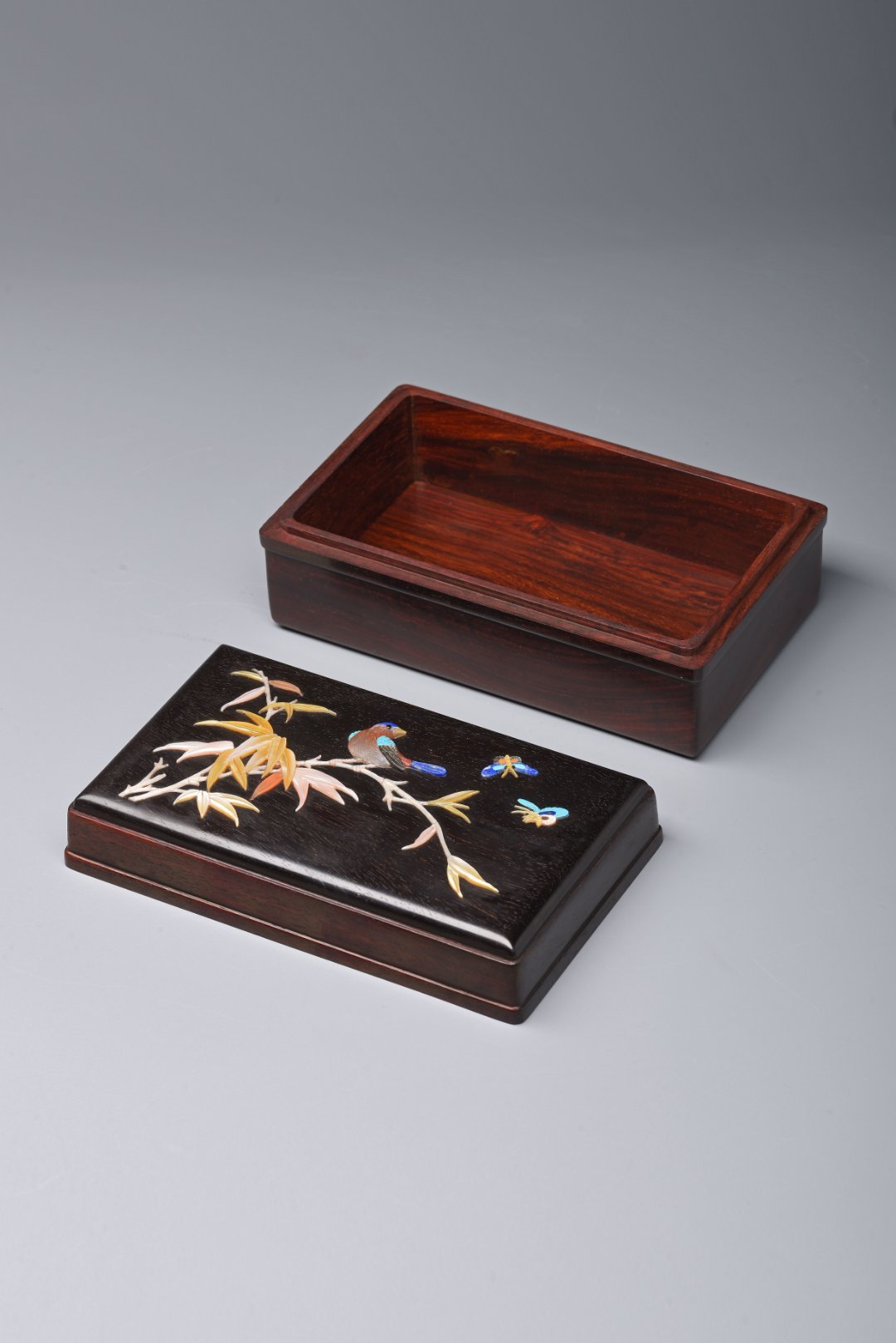 小叶紫檀百宝嵌 | 竹雀图 文盒全独板榫卯制作,器型简约大方,百宝嵌竹雀图,精丽典雅,可置章石珠玉,使用美物。15*9*6cm 重330克