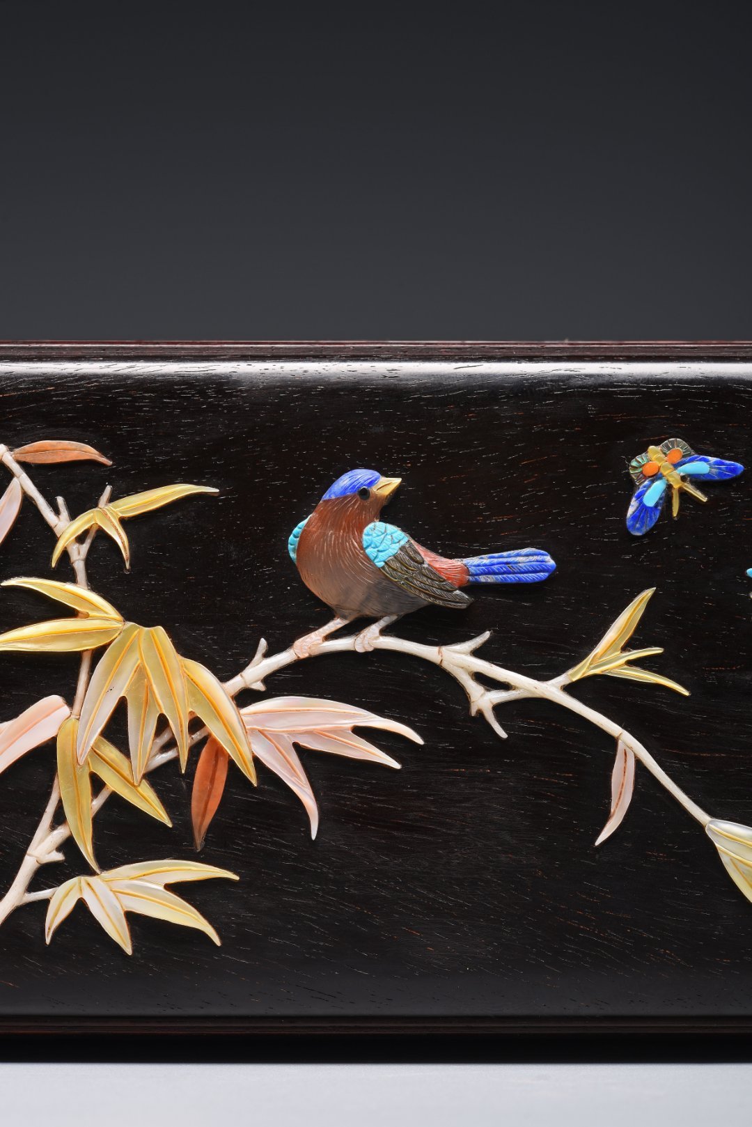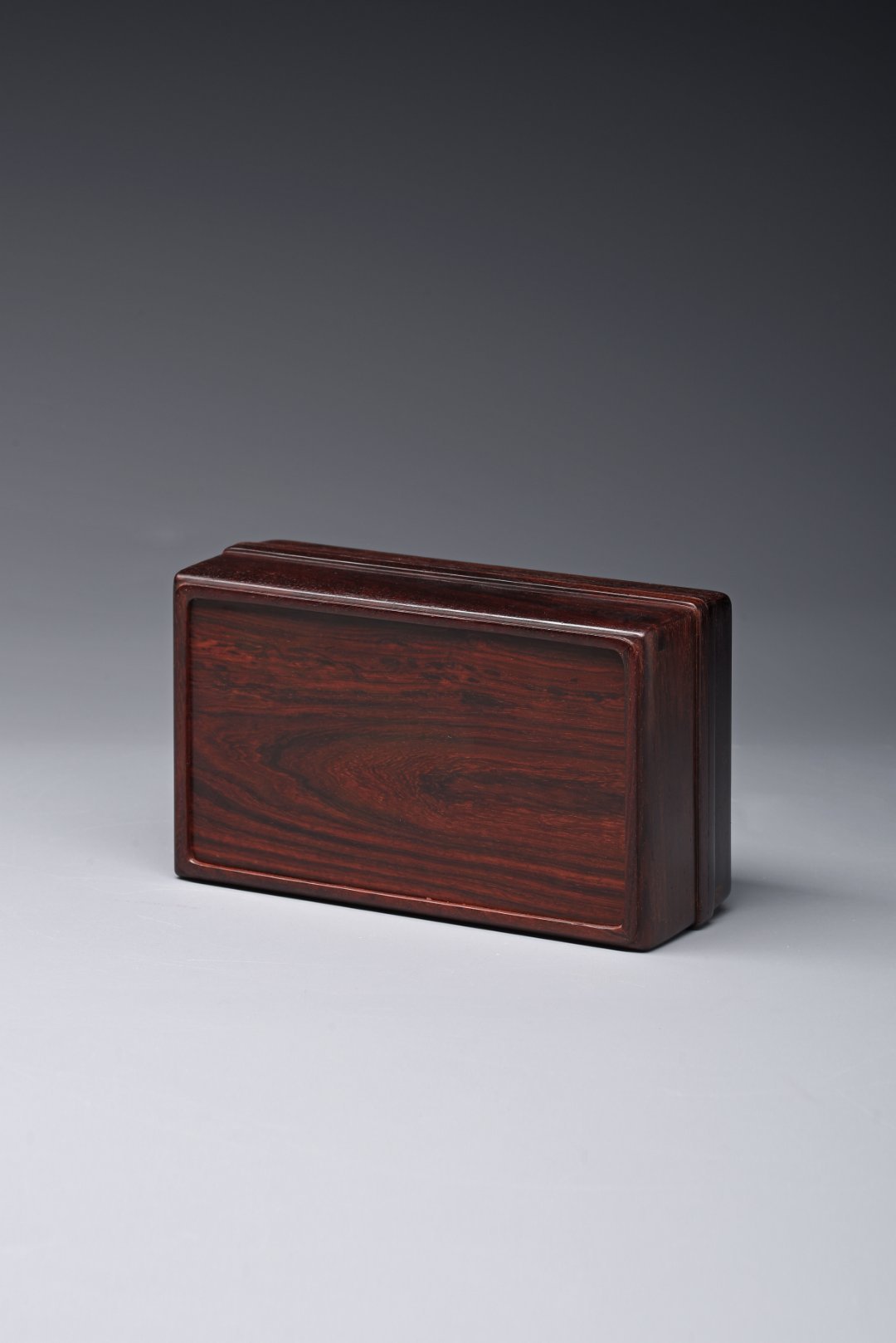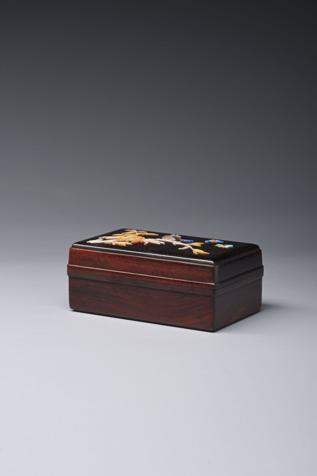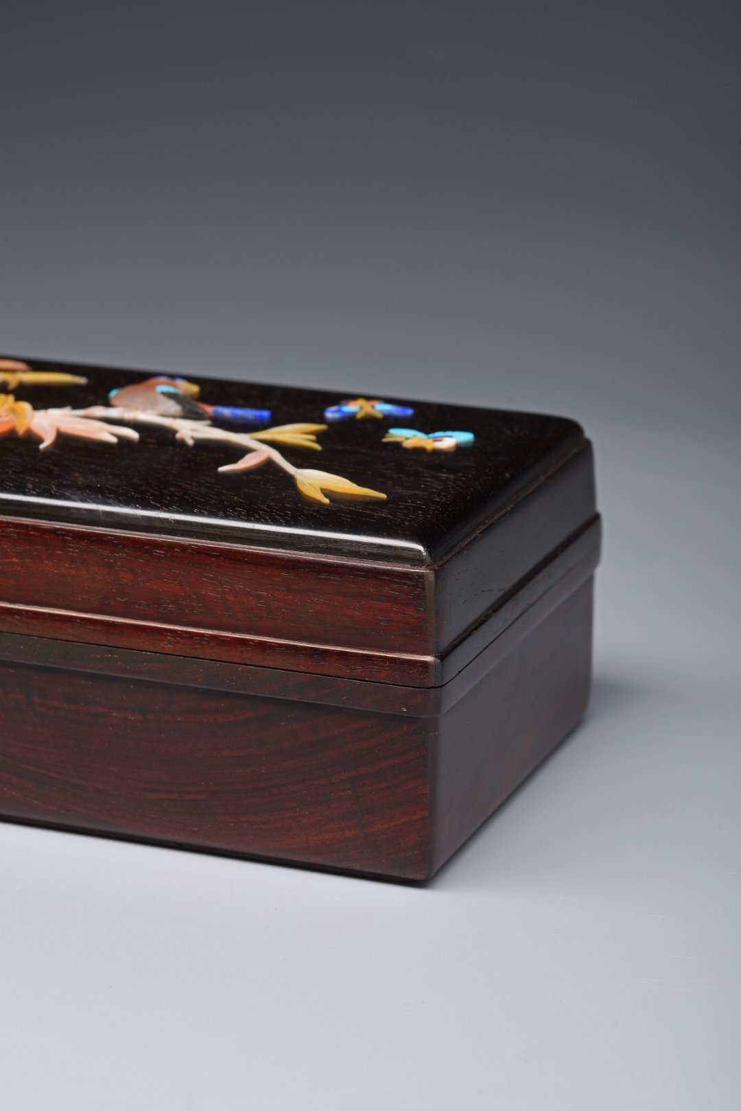 小叶紫檀百宝嵌 | 竹雀图 文盒全独板榫卯制作,器型简约大方,百宝嵌竹雀图,精丽典雅,可置章石珠玉,使用美物。15*9*6cm 重330克