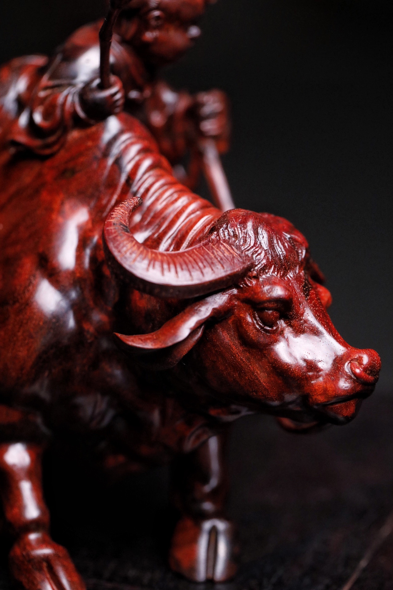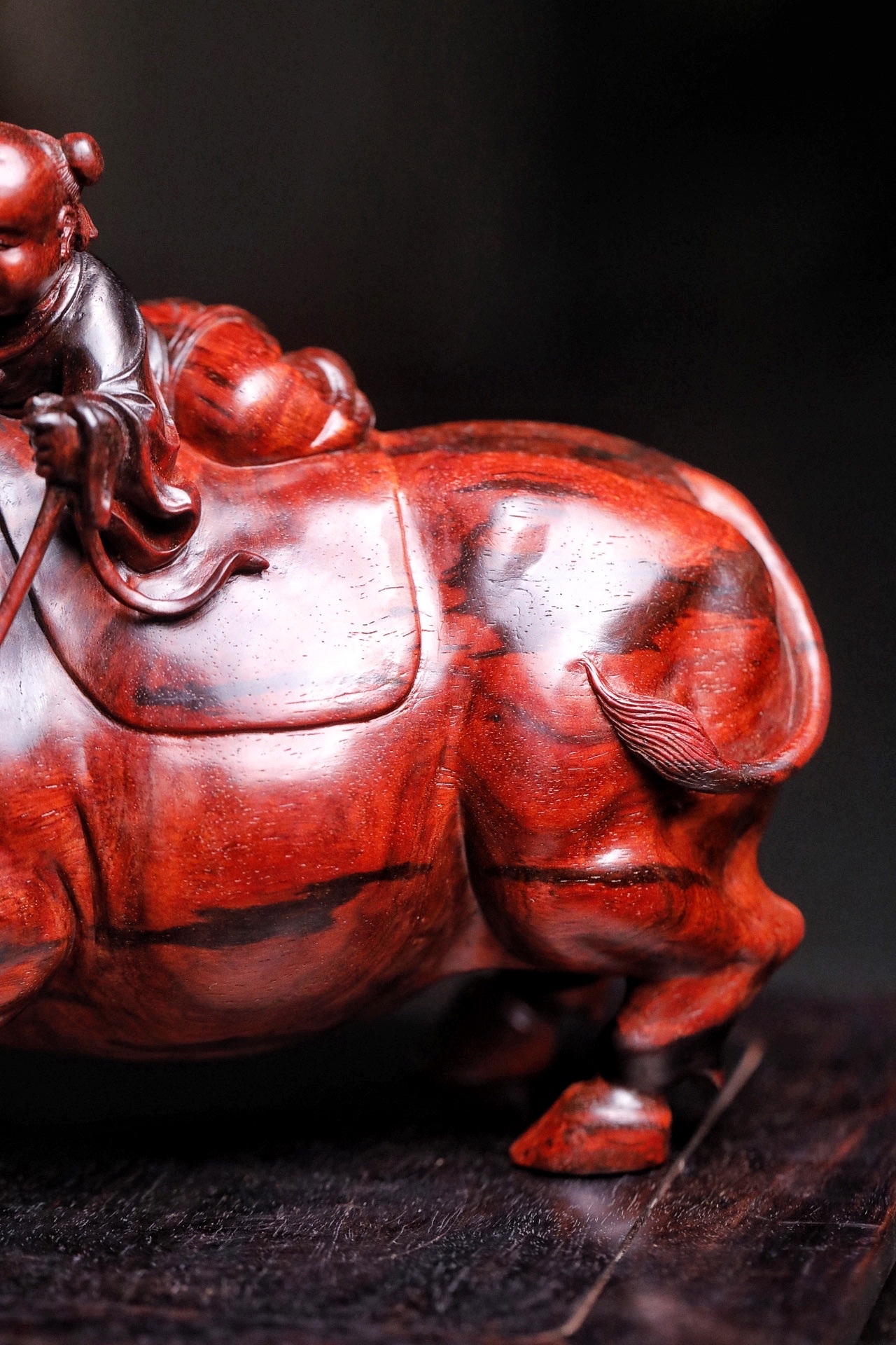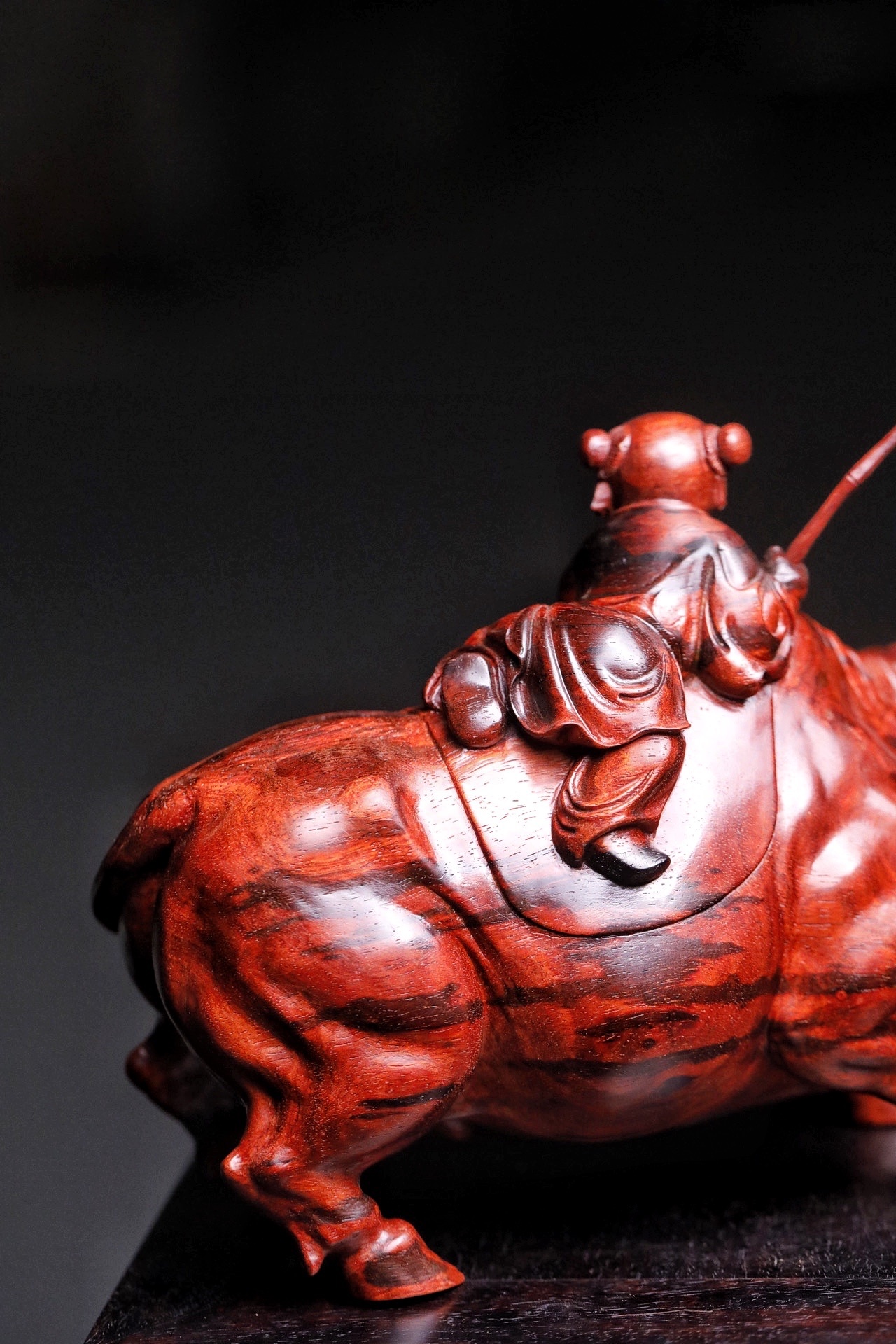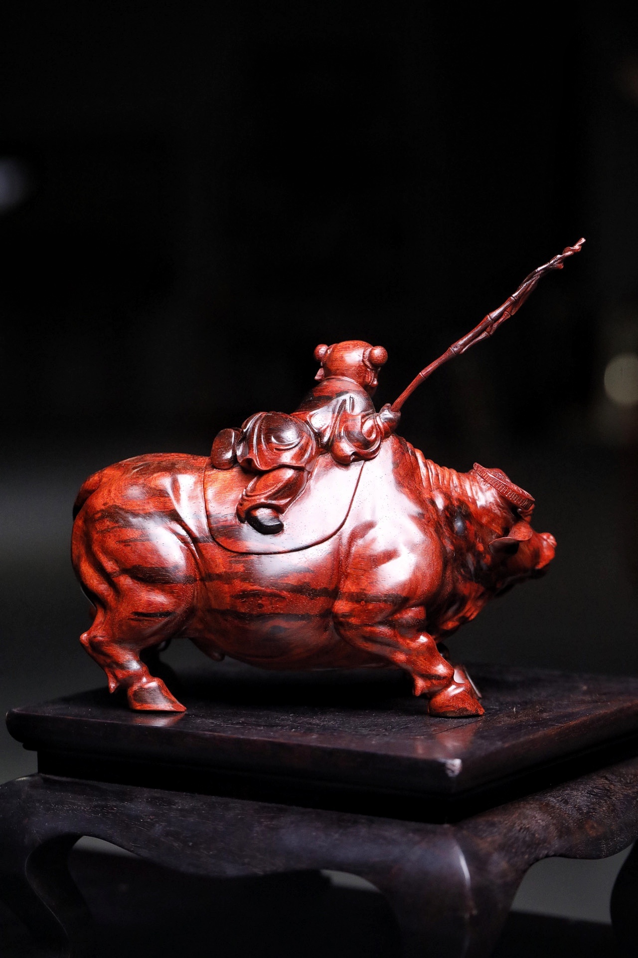 小叶紫檀|牧牛童子高油密老料成器,整木雕琢牧牛童子。童子憨态可掬,水牛身形雄健,纹理随木势流转,尽显朴拙鲜活之趣。22×11×21cm重量1232g