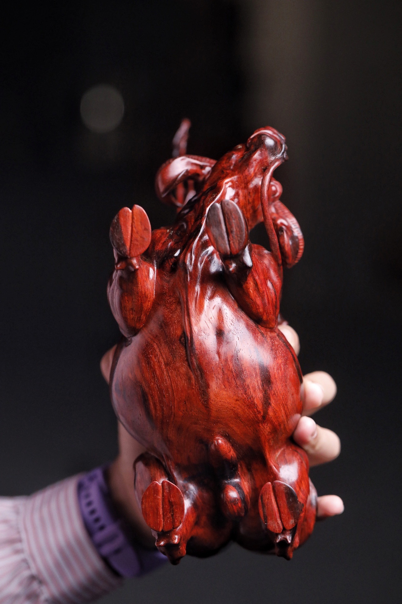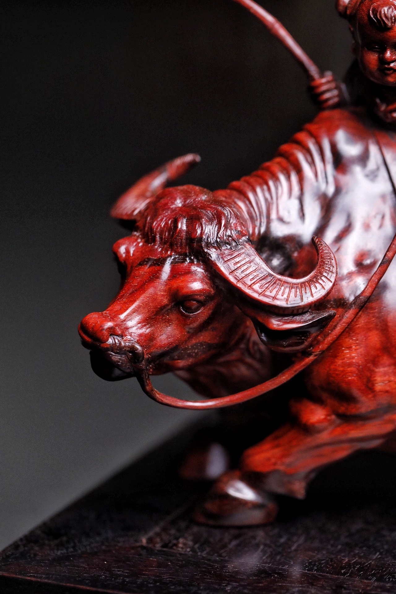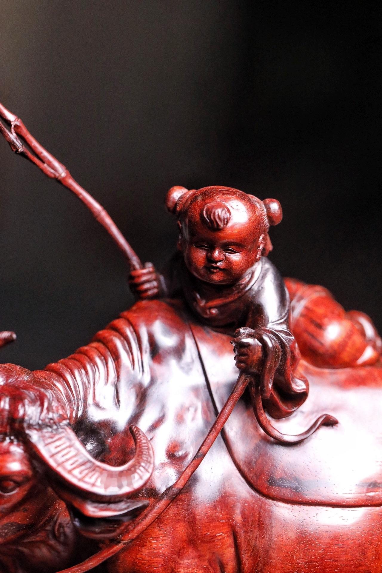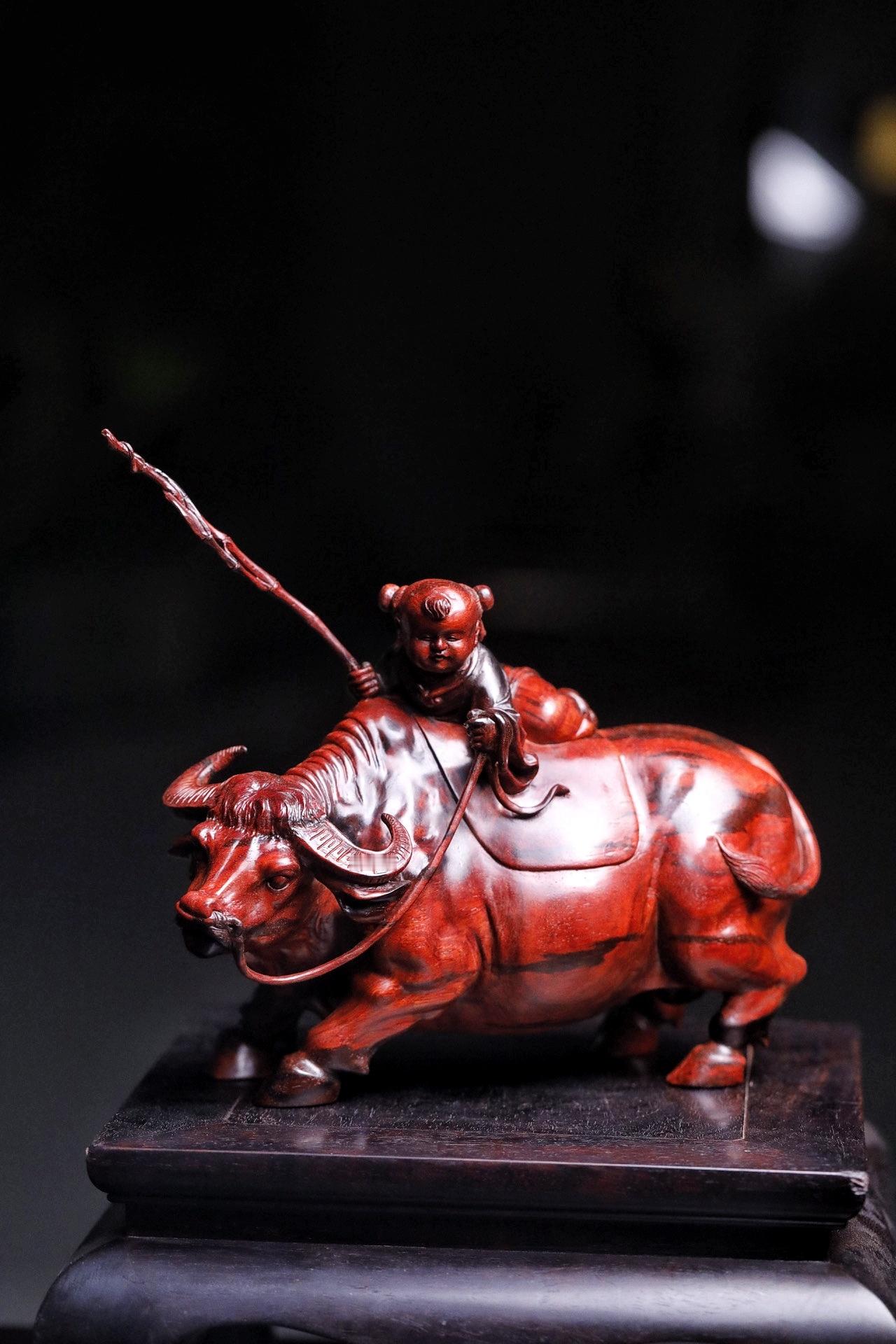 小叶紫檀|牧牛童子高油密老料成器,整木雕琢牧牛童子。童子憨态可掬,水牛身形雄健,纹理随木势流转,尽显朴拙鲜活之趣。22×11×21cm重量1232g
