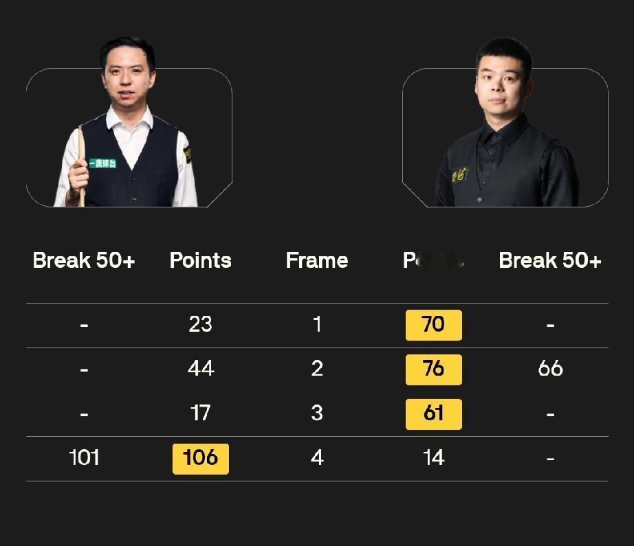庞俊旭 3-1 肖国栋 大卫·吉尔伯特 2-2 马克·威廉姆斯 12月1日凌晨3点,斯诺克英锦赛正赛首轮开始了第七场和第八场的争夺,肖国栋对阵庞俊旭、马克·威廉姆斯对阵大卫·吉尔伯特。 在已经结束的六场比赛中,斯佳辉6-0瑞恩·戴、吴宜泽6-4米切尔·霍尔特、肖恩·墨菲6-2吕昊天、卫冕冠军贾德·特鲁姆普6-4斯蒂芬·马奎尔、约翰·希金斯6-2本·沃拉斯顿、尼尔·罗伯逊6-2朱利安·勒克莱。 第七场和第八场比赛的胜者将在16进8轮次相遇。 前四局,庞俊旭3-1肖国栋、吉尔伯特2-2威廉姆斯。
