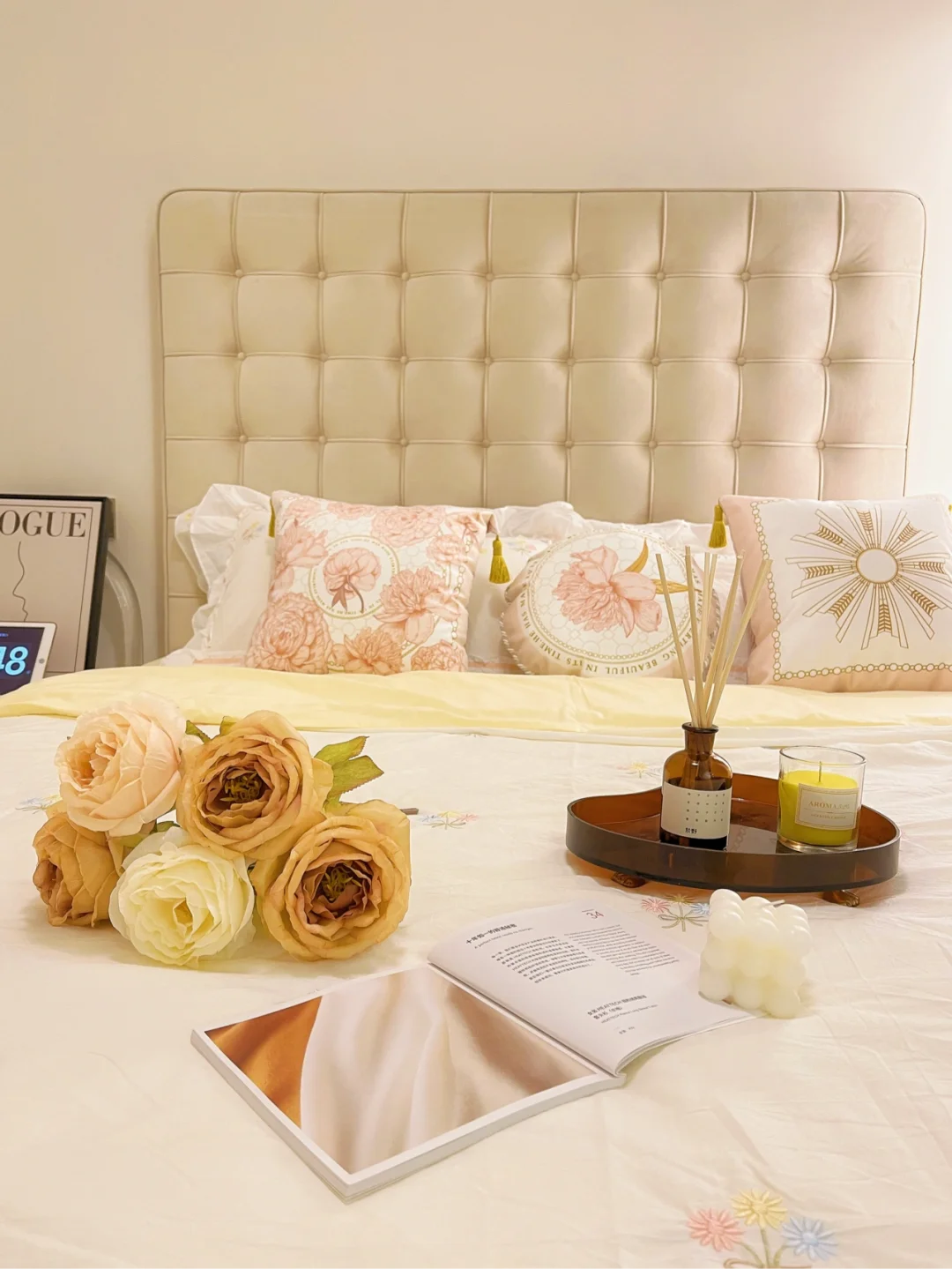 ✔️次卧选择了一块高床头、丝绒米杏色靠背床,颜值和质感满分,整体搭配下来温柔奶油风格