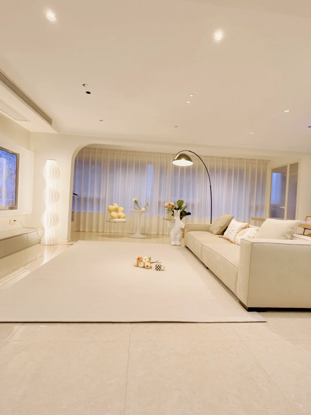 ✔️客厅坚持浅色系,显大而且软装好搭配,地毯选择与沙发同色系的米色,羊毛材质脚感敦厚,客厅的高级感一下子就有了!