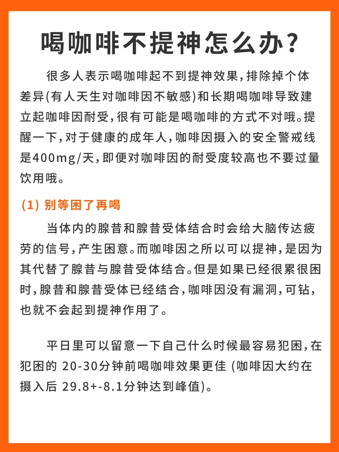 之前我们讲过,当体内的腺苷和腺苷受体结合时,会给大脑传达疲劳的信号,产生困意。而咖啡因之所以可以提神,是因为其代替了腺苷与腺苷受体结合。但是如果已经很累很困时,腺苷和腺苷受体已经结合,咖啡因没有「漏洞」可钻,也就不会起到提神作用了。平日里可以留意一下自己什么时候最容易犯困,在犯困的20-30分钟前(咖啡因大约在摄入后29.8+-8.1min达到峰值)喝咖啡效果更佳。