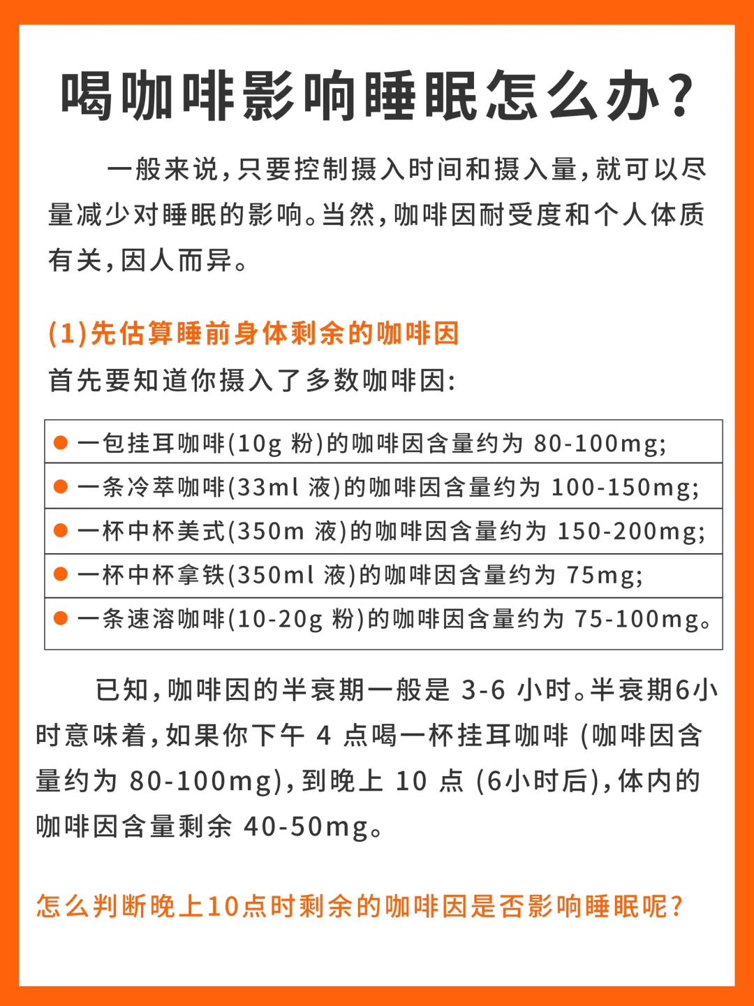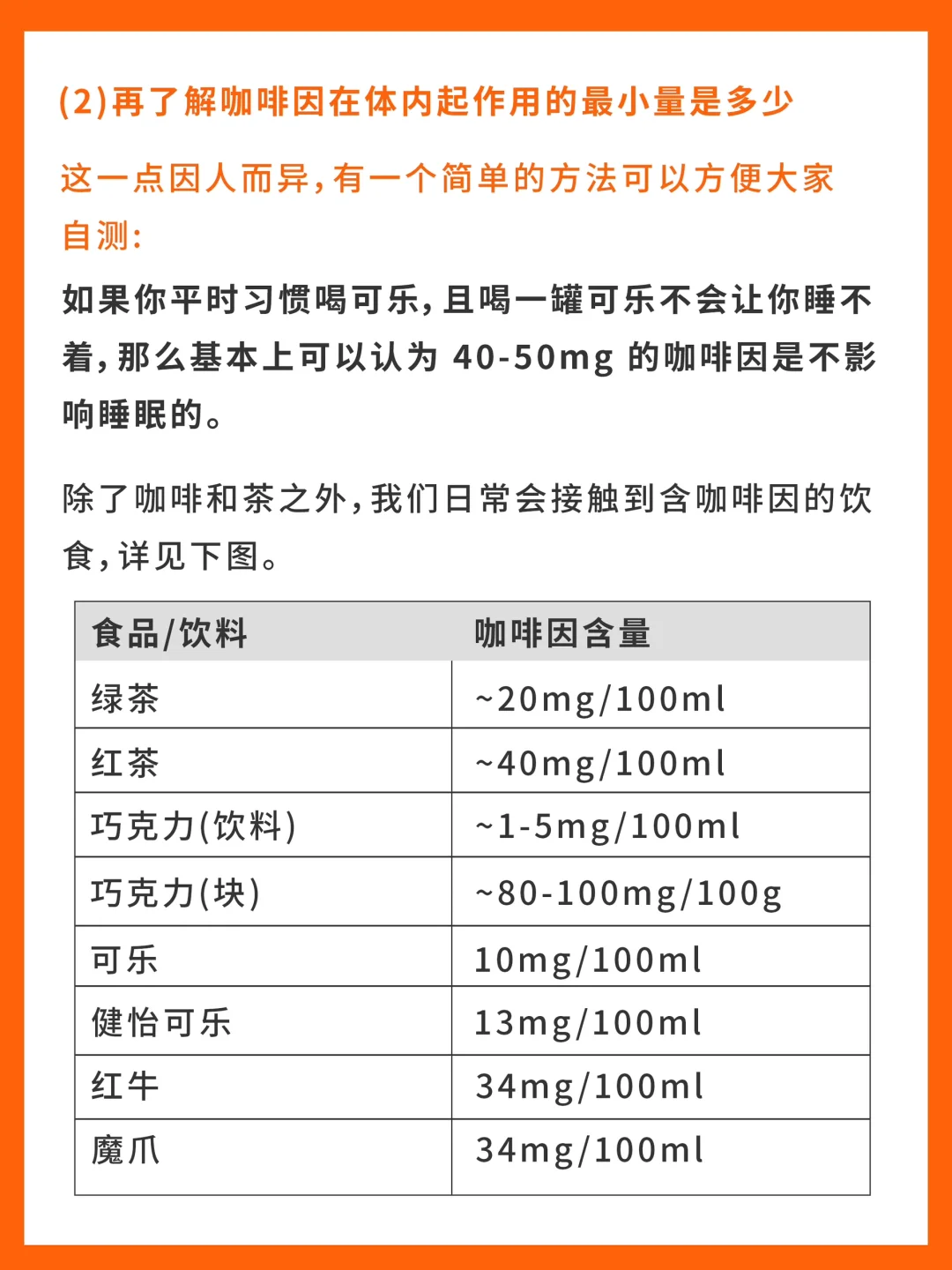 这一点因人而异,有一个简单的方法可以方便大家自测:如果你平时习惯喝可乐,且喝一罐可乐不会让你睡不着,那么基本上可以认为40-50mg的咖啡因是不影响睡眠的。