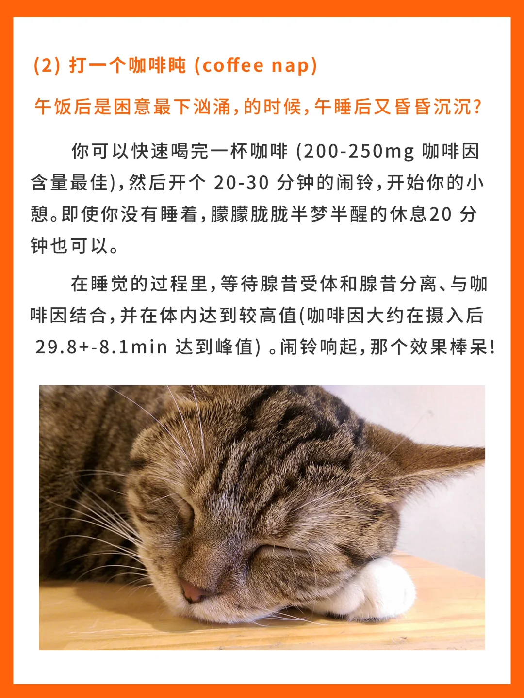 你可以快速喝完一杯咖啡(200-250mg咖啡因含量最佳),然后开个20-30分钟的闹铃,开始你的小憩。即使你没有睡着,朦朦胧胧半梦半醒的休息20分钟也可以。在睡觉的过程里,等待腺苷受体和腺苷分离、与咖啡因结合,并在体内达到较高值(咖啡因大约在摄入后