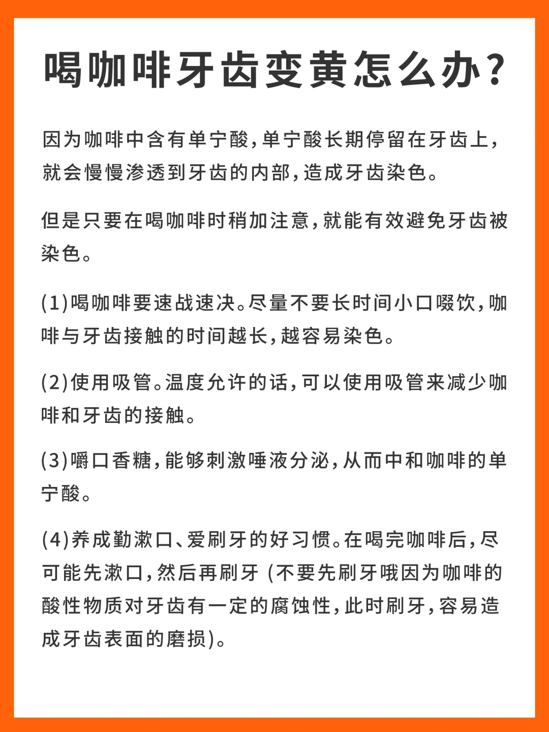 (1)喝咖啡尽量不要长时间小口啜饮,咖啡与牙齿接触的时间越长,越容易染色。
