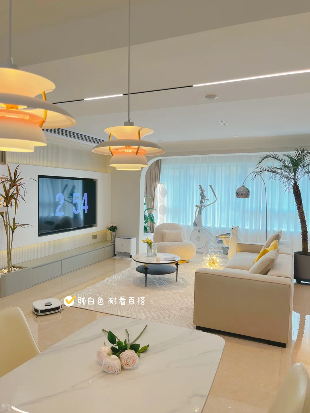 现在的新房层高都不足,我家改造前层高2.65m,如果再选择主灯的话空间会很压抑,所以我家最终还是选择了无主灯,吊顶的话也是选择了简约的大平顶,❗️仔细看的话会发现吊顶四周还做了阴角弧,简约又有设计感!下吊后层高2.58m,搭配了30个筒灯、20个射灯和轨道灯,视觉上客厅的空间更开阔,🌟各个角落的光线也足够,不会存在暗区。