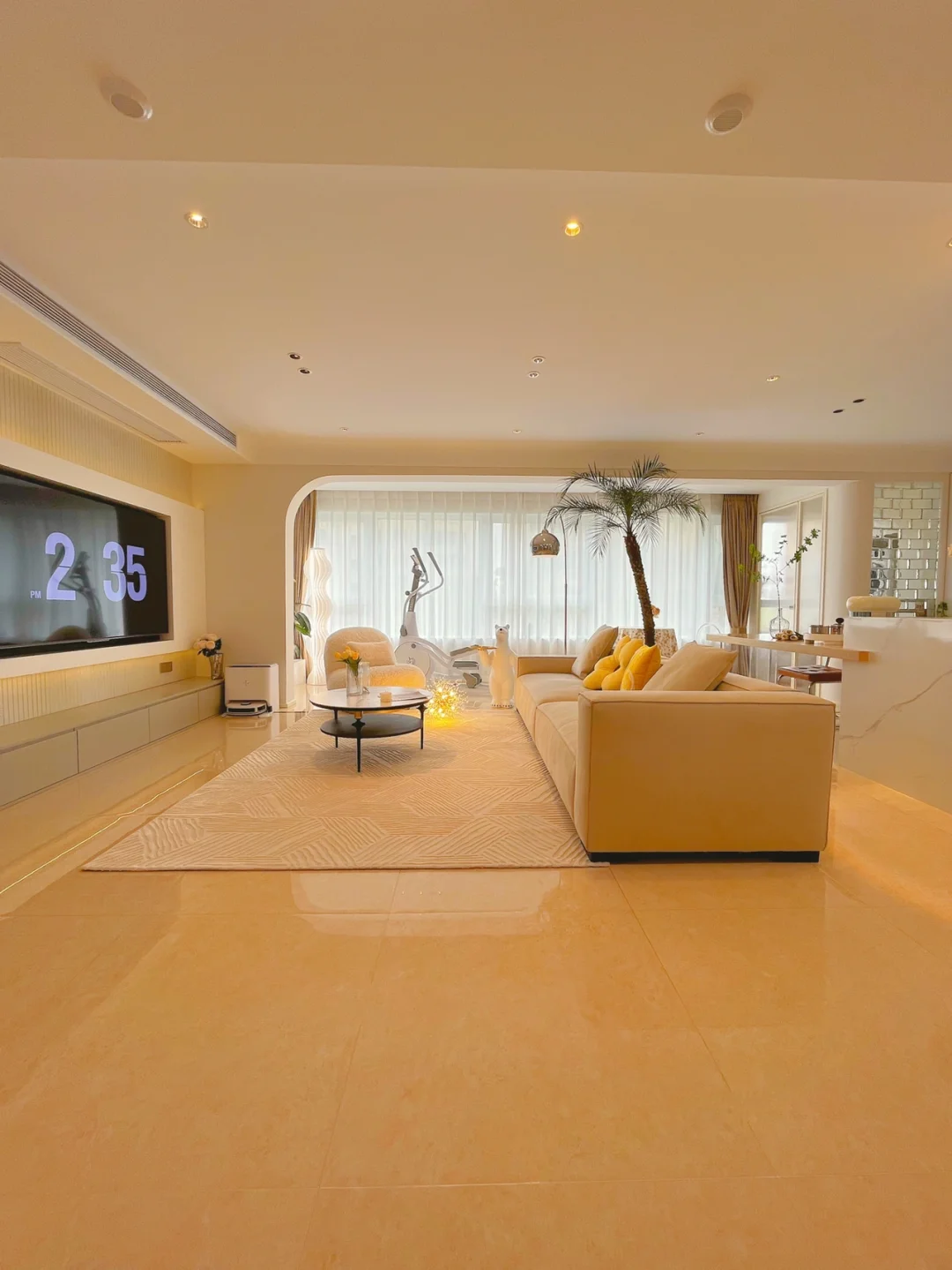 打掉阳台推拉门后,垭口做了拱形,不包门套,整个客厅空间感又大了一倍!