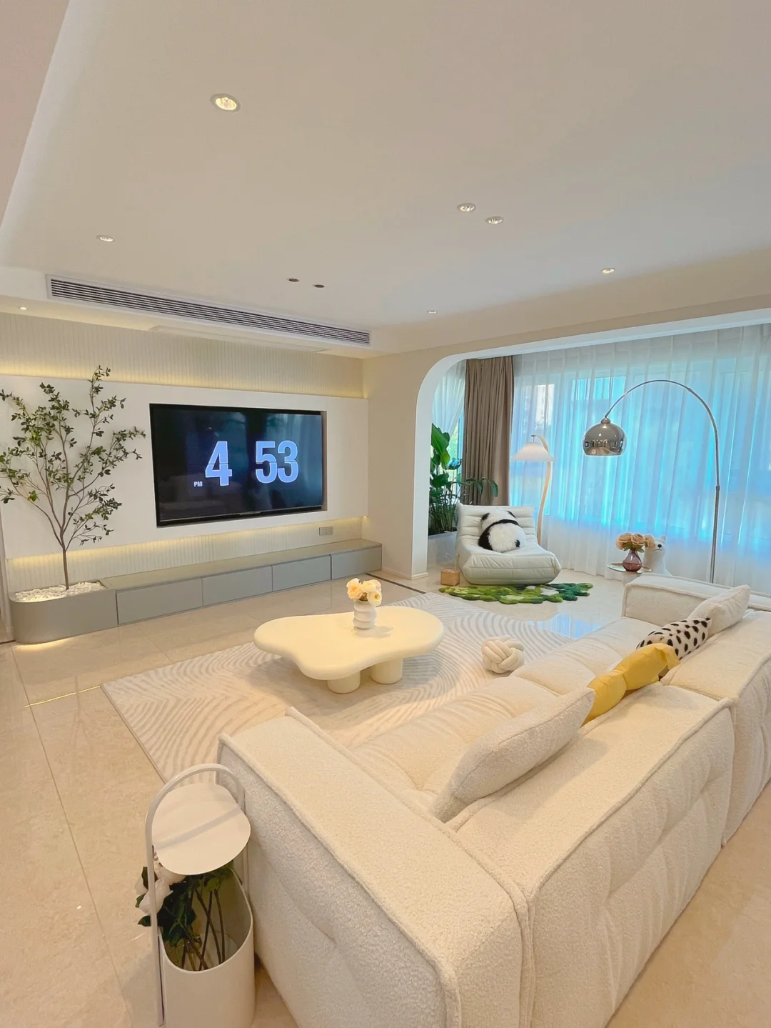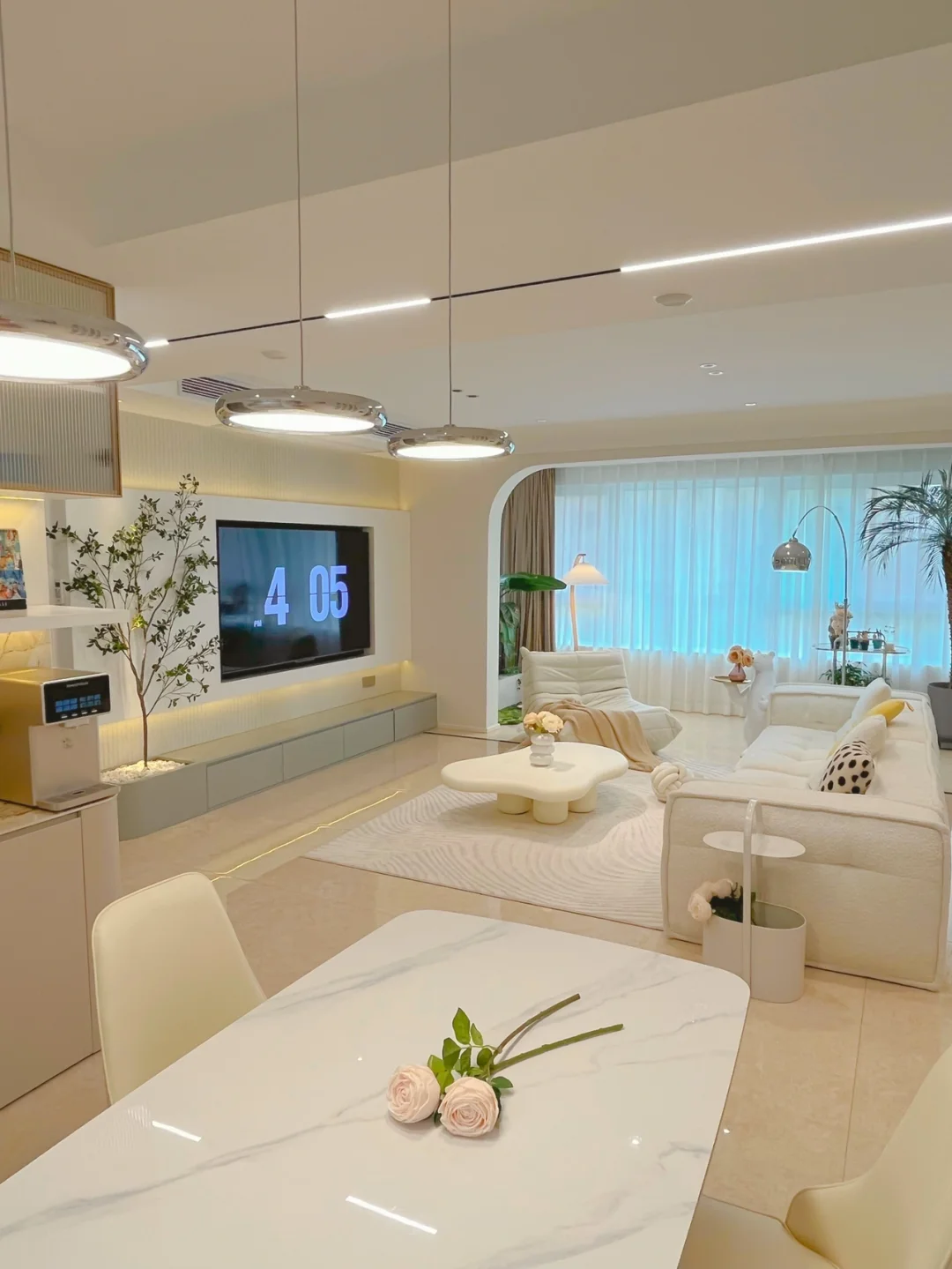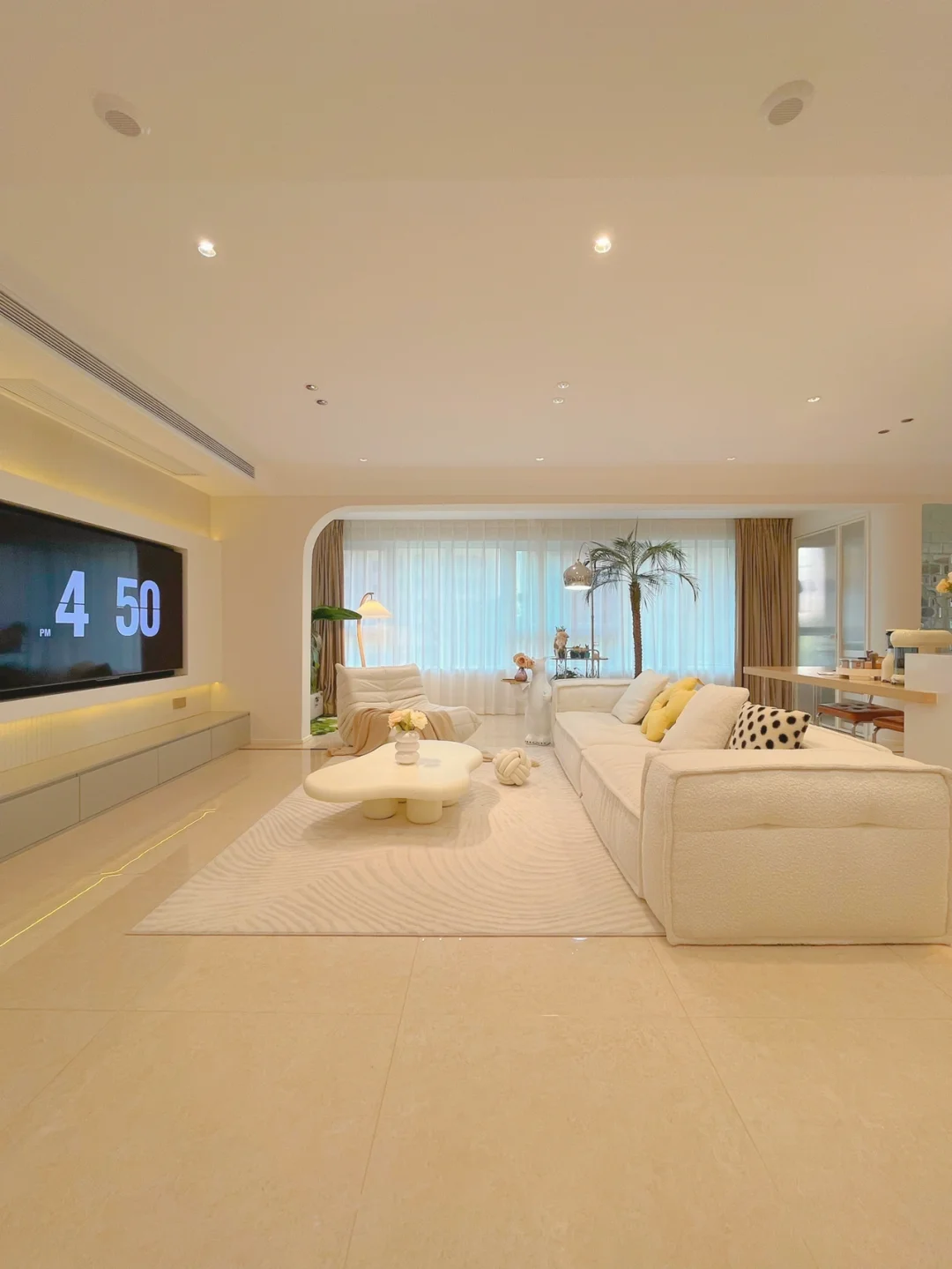 我家做的无主灯,相比吊灯,显得更开阔。客厅整体吊了平顶,茶几、岛台还有衣柜上方用的射灯,用来重点照明,其余部分用的筒灯,负责基础照明。