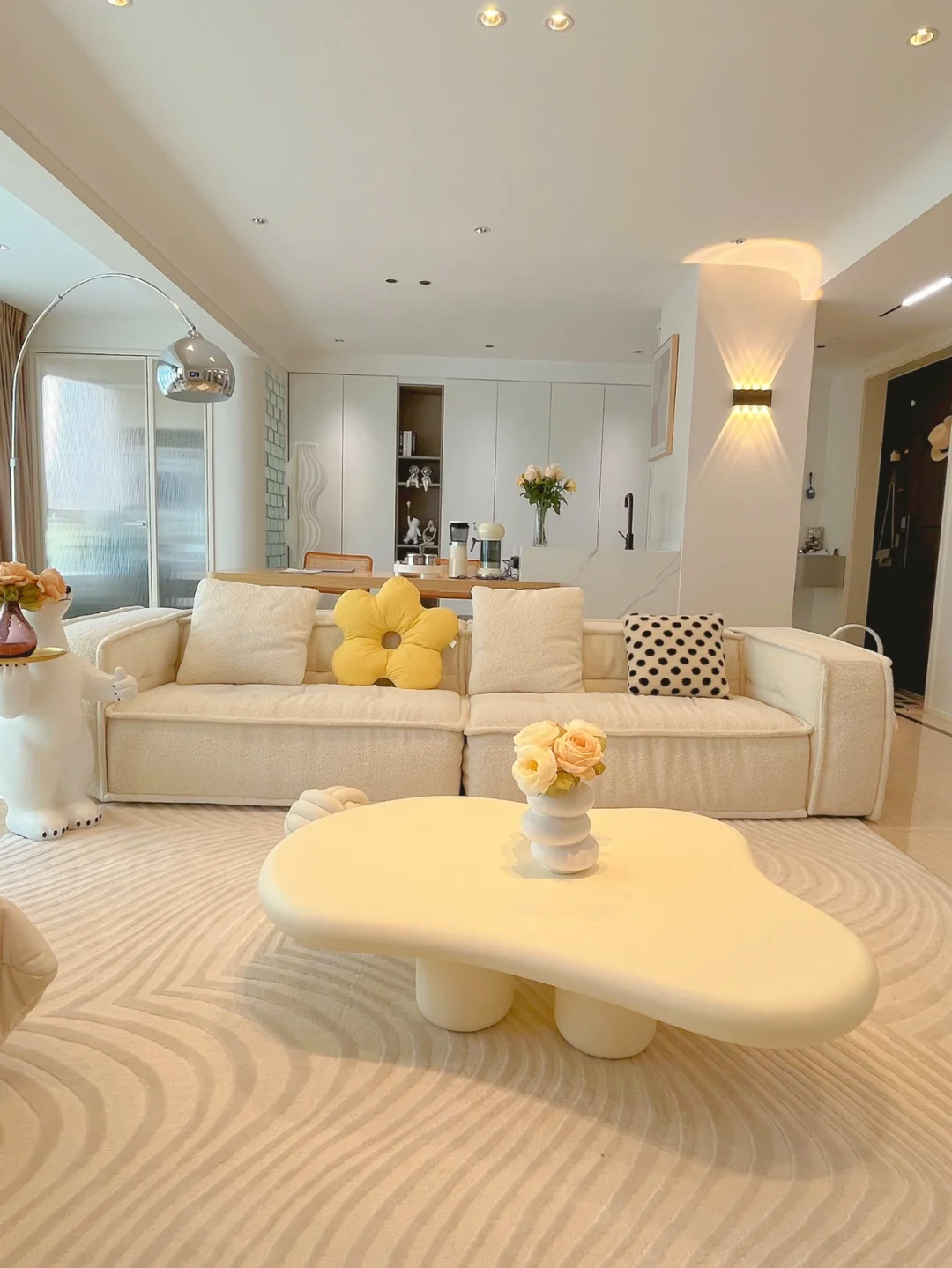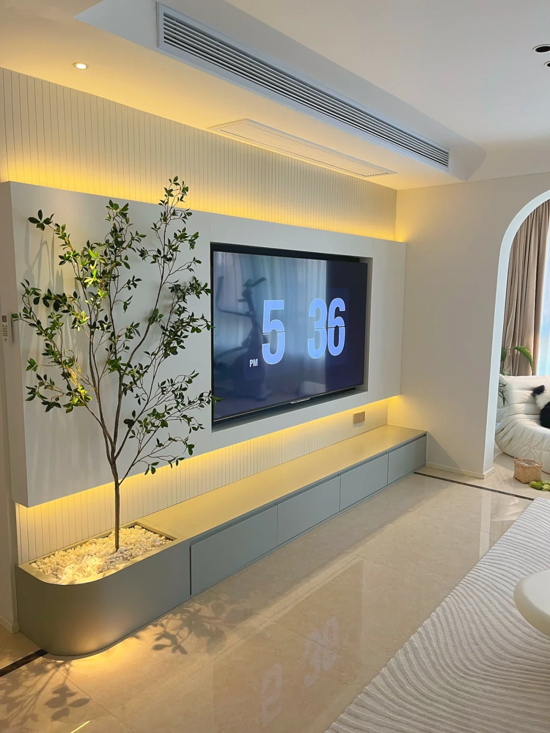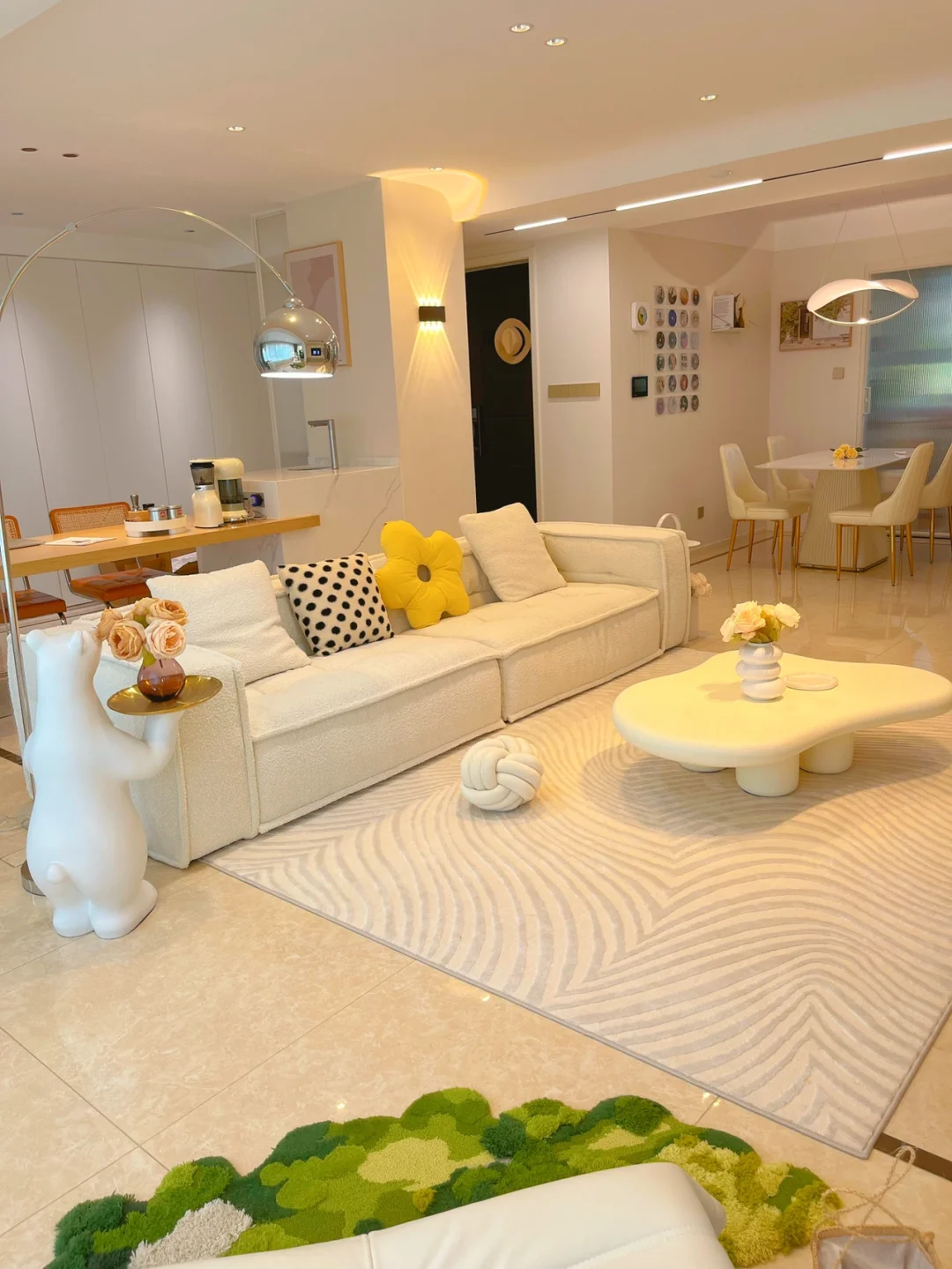 我家做的无主灯,相比吊灯,显得更开阔。客厅整体吊了平顶,茶几、岛台还有衣柜上方用的射灯,用来重点照明,其余部分用的筒灯,负责基础照明。