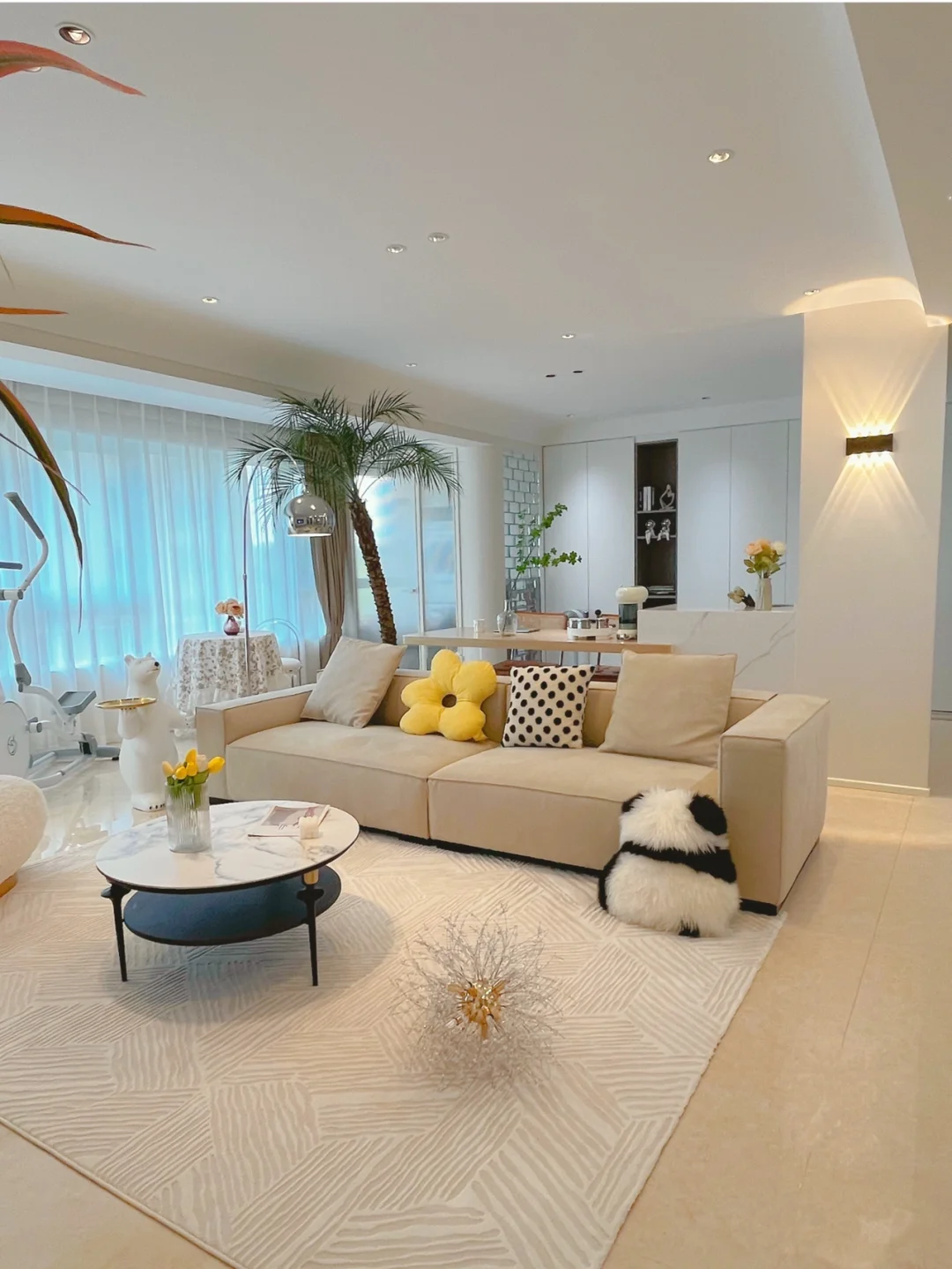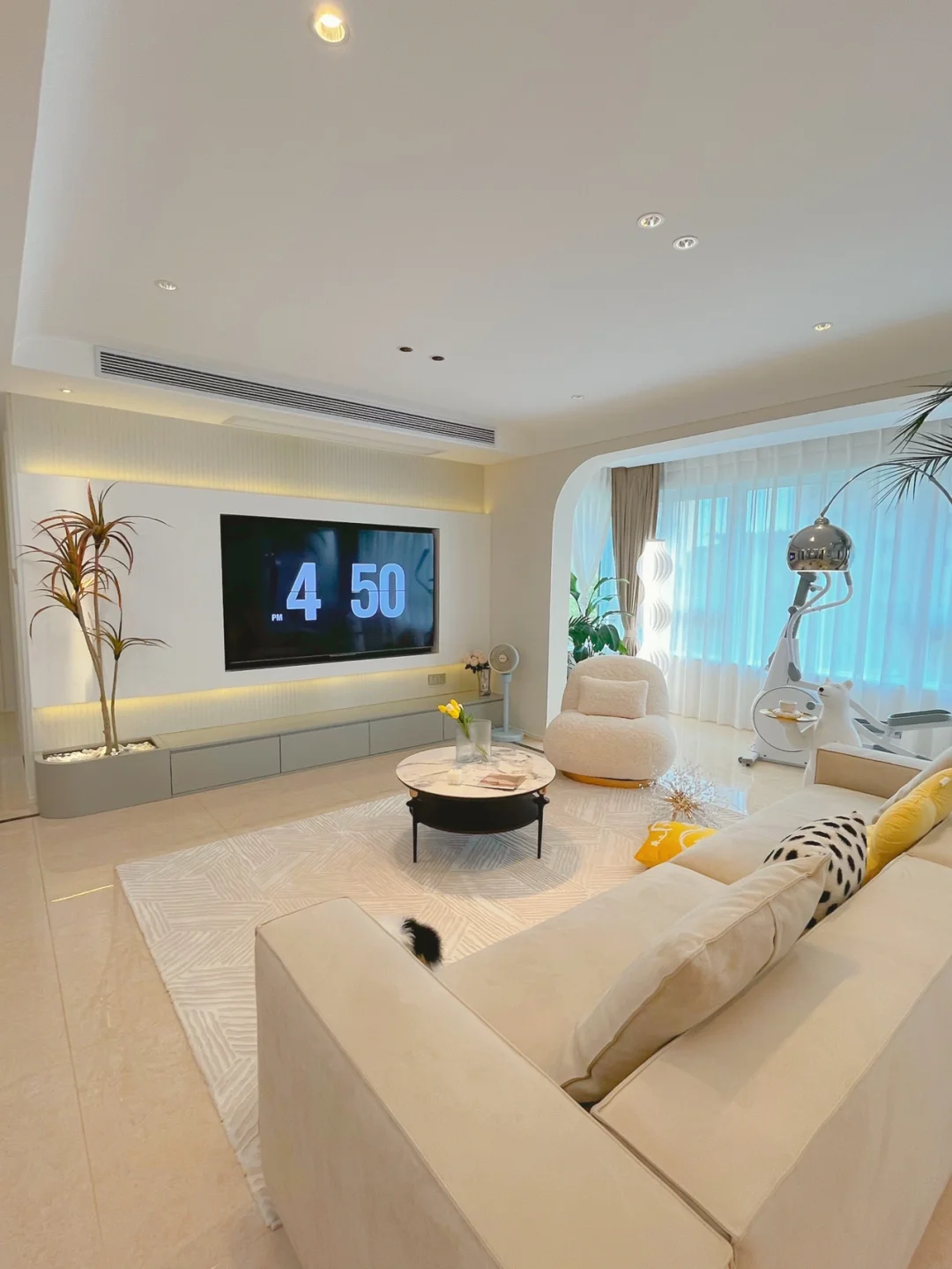 👉我家客餐厅加上阳台一起面积55平,风管机装在了电视背景墙上方,也正好包住这里的梁,配合全屋平顶,视觉上显得更开阔。