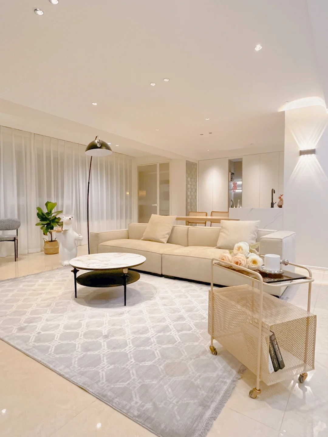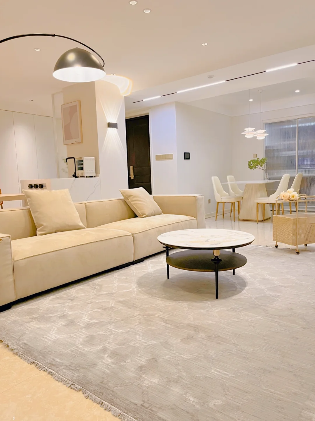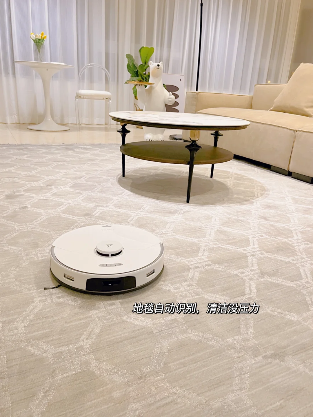 全屋刷了浅浅的杏子灰,地砖通铺,装修时就在想要在客厅放一大块地毯,最后咬牙拿下了这块,贵也有贵的道理。羊毛的脚感敦厚,每晚都想瘫在地毯上追剧。不做门槛石,简单又方便打扫。我一般下班没到家前会让扫拖机器人全家清扫一遍,家里即使有地毯,也能自动抬起拖布,不会弄湿,全家各个区域整的干干净净,还不用我洗抹布,下班到家,不用再忙着打扫卫生啦!幸福!