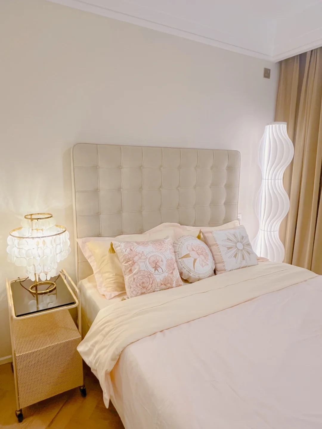 卧室还是选择奶油系更适睡哦~奶油色的背景墙搭配米杏色床头,简直太满足我的少女心了!