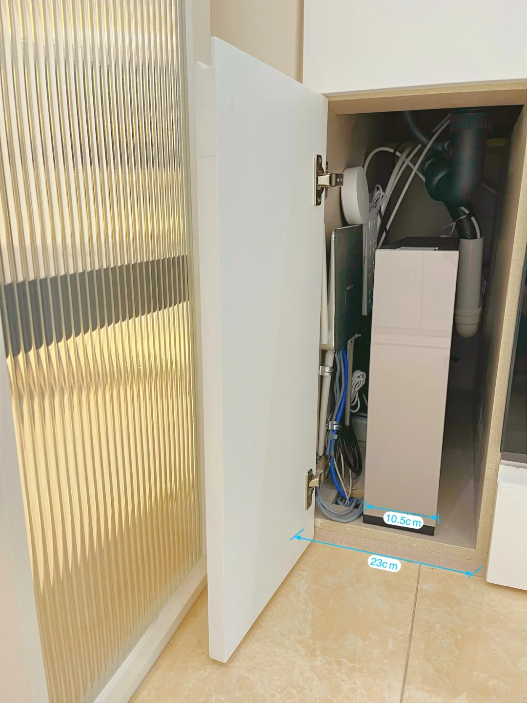 现在选择的这款体积很小,宽度才10cm多点,我把弱电设备装在侧板后,净水器刚好可以塞进去。[斜眼R]