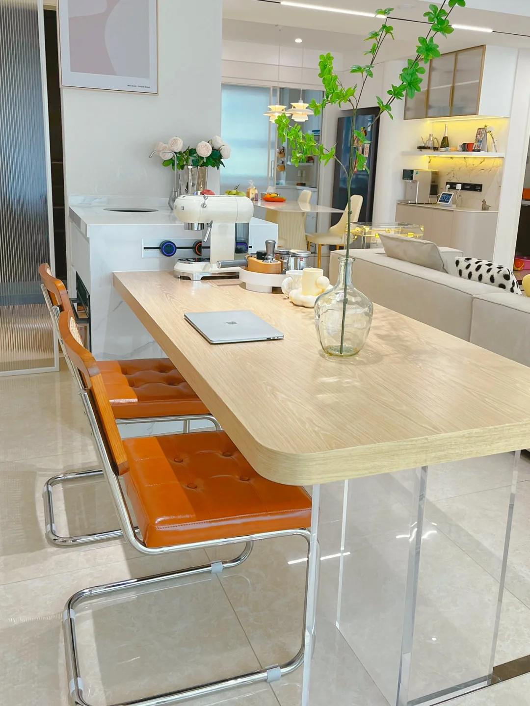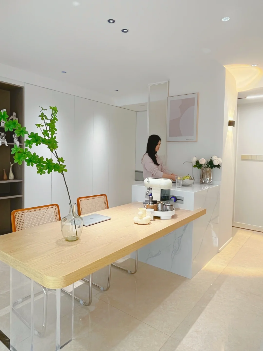 所以它既可以做水吧台,也可以做烘培、做咖啡,还是我家的办公桌,平时朋友过来甚至也是变成大餐桌!而且我家的弱电箱也藏在岛台柜子里🤭
