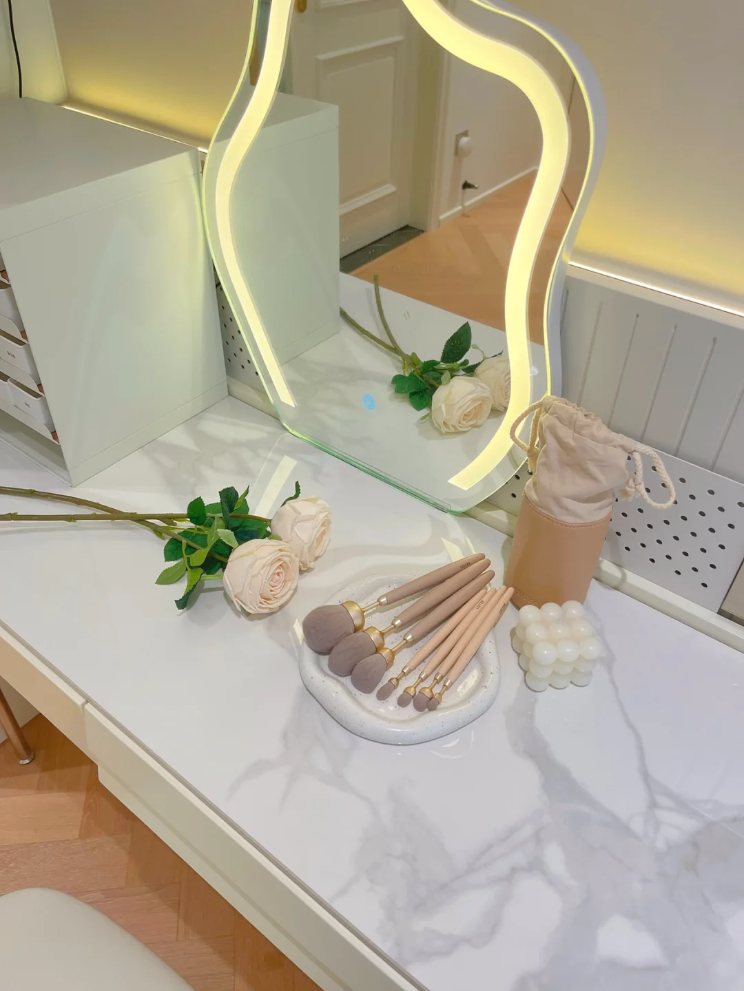 梳妆台上东西不多,能收起来的化妆品都放进了旁边的信封收纳盒里,奶茶尾巴化妆刷可以满足我日常的化妆需要,奶奶的茶色很难抵御呀~