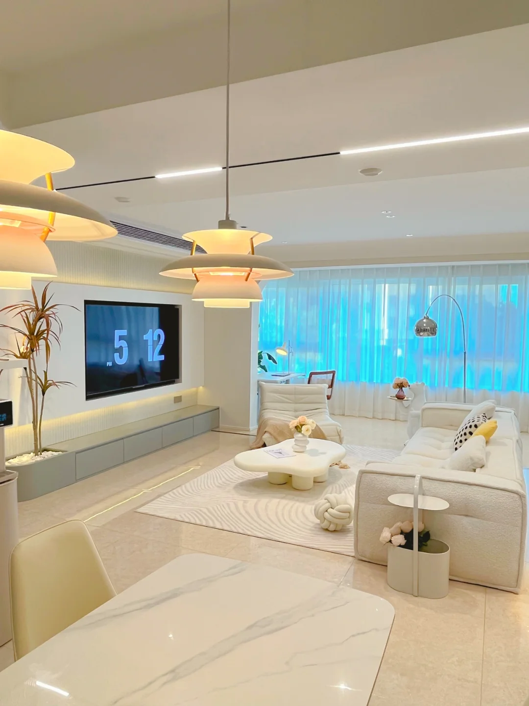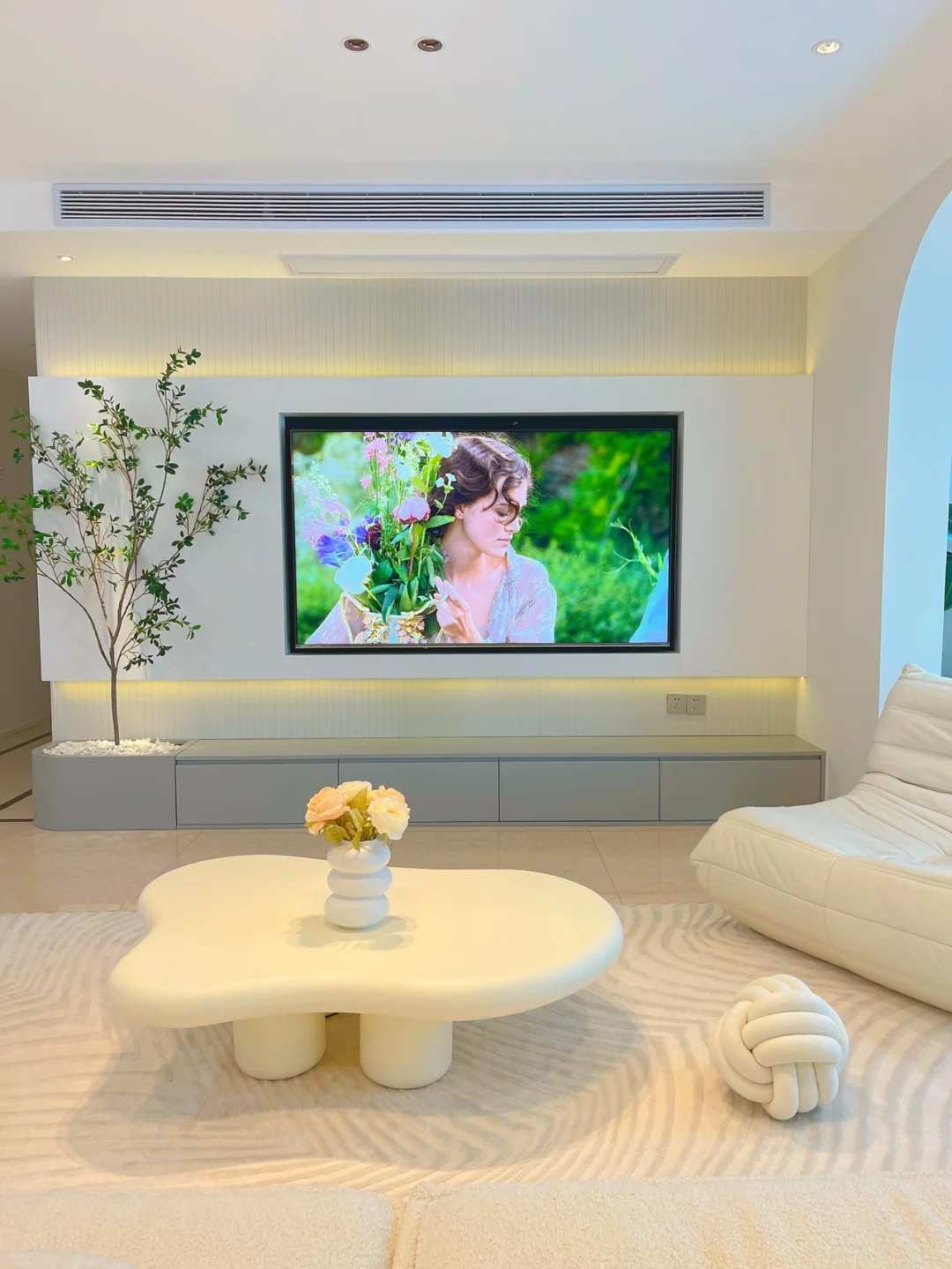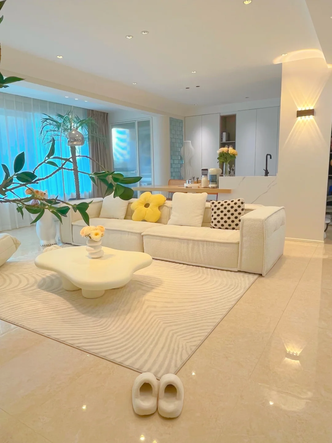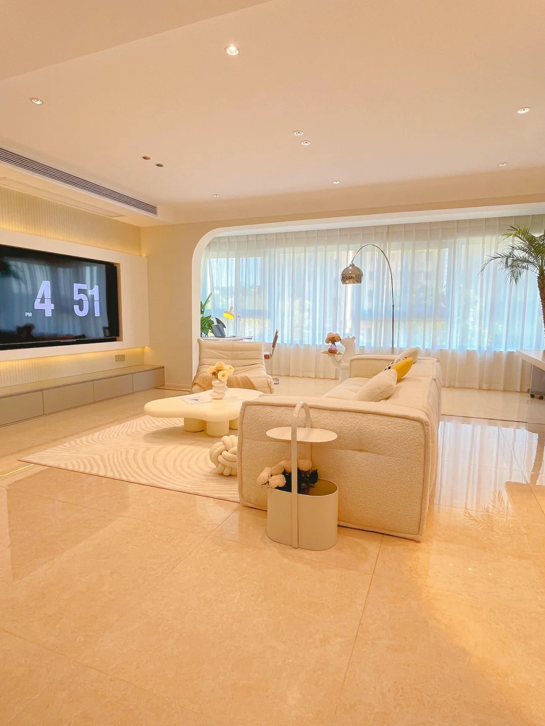 客厅的沙发和茶几都是奶白色,温温柔柔,好看就完了~