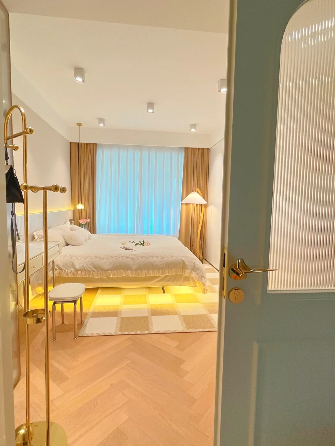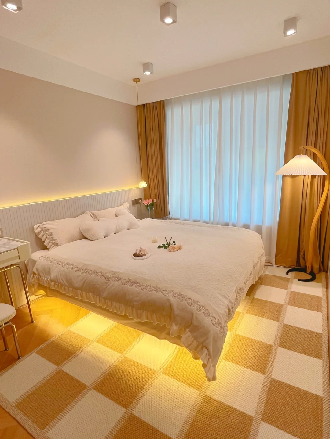 主卧搭配的奶咖色系,悬浮床没有床头,很省空间也很有设计感