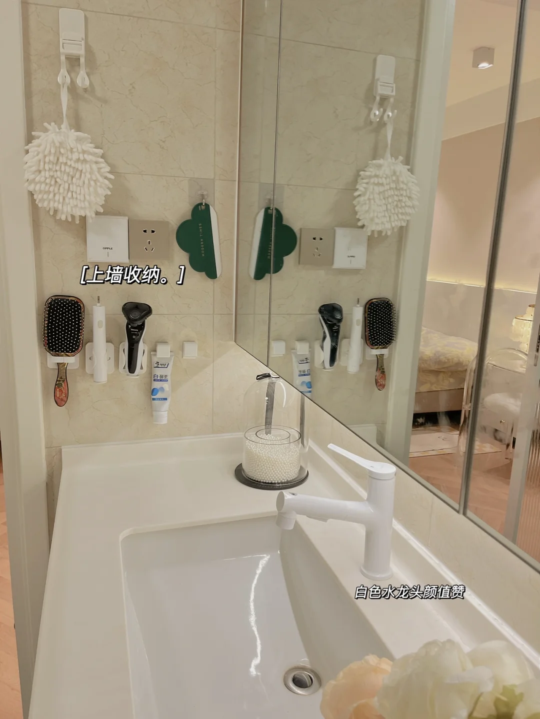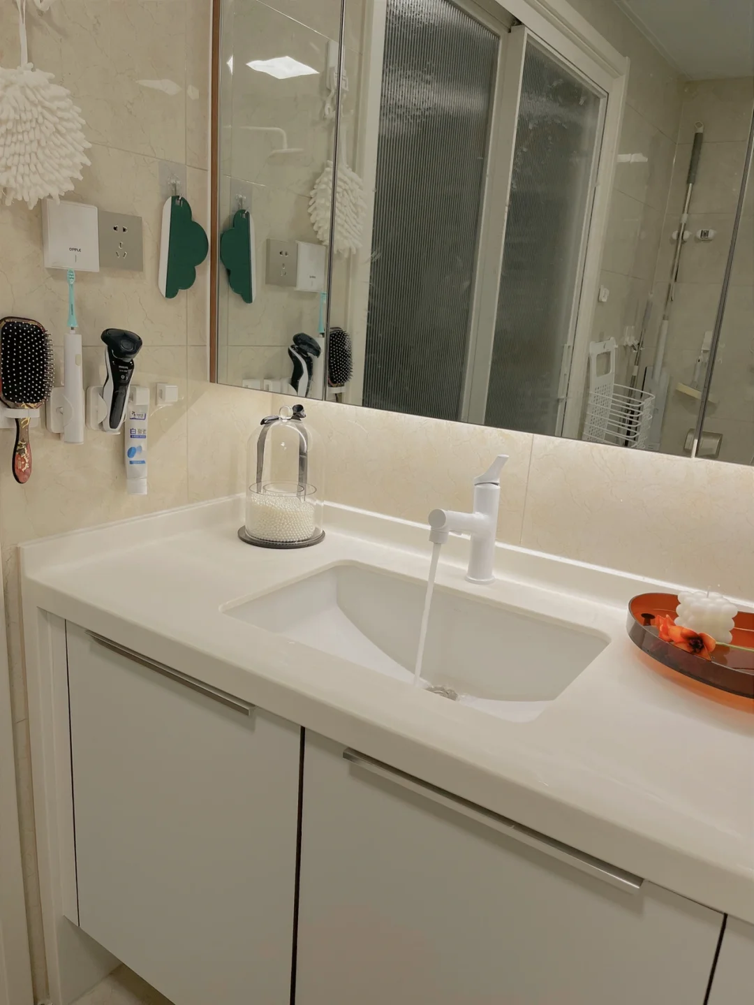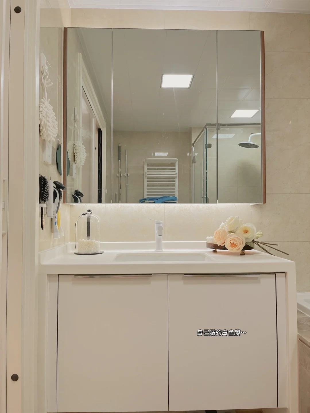 把原来浴室柜柜门贴了一张白色膜,水龙头也换成了白色🉑️抽拉款,花小钱也能出大效果,hhh