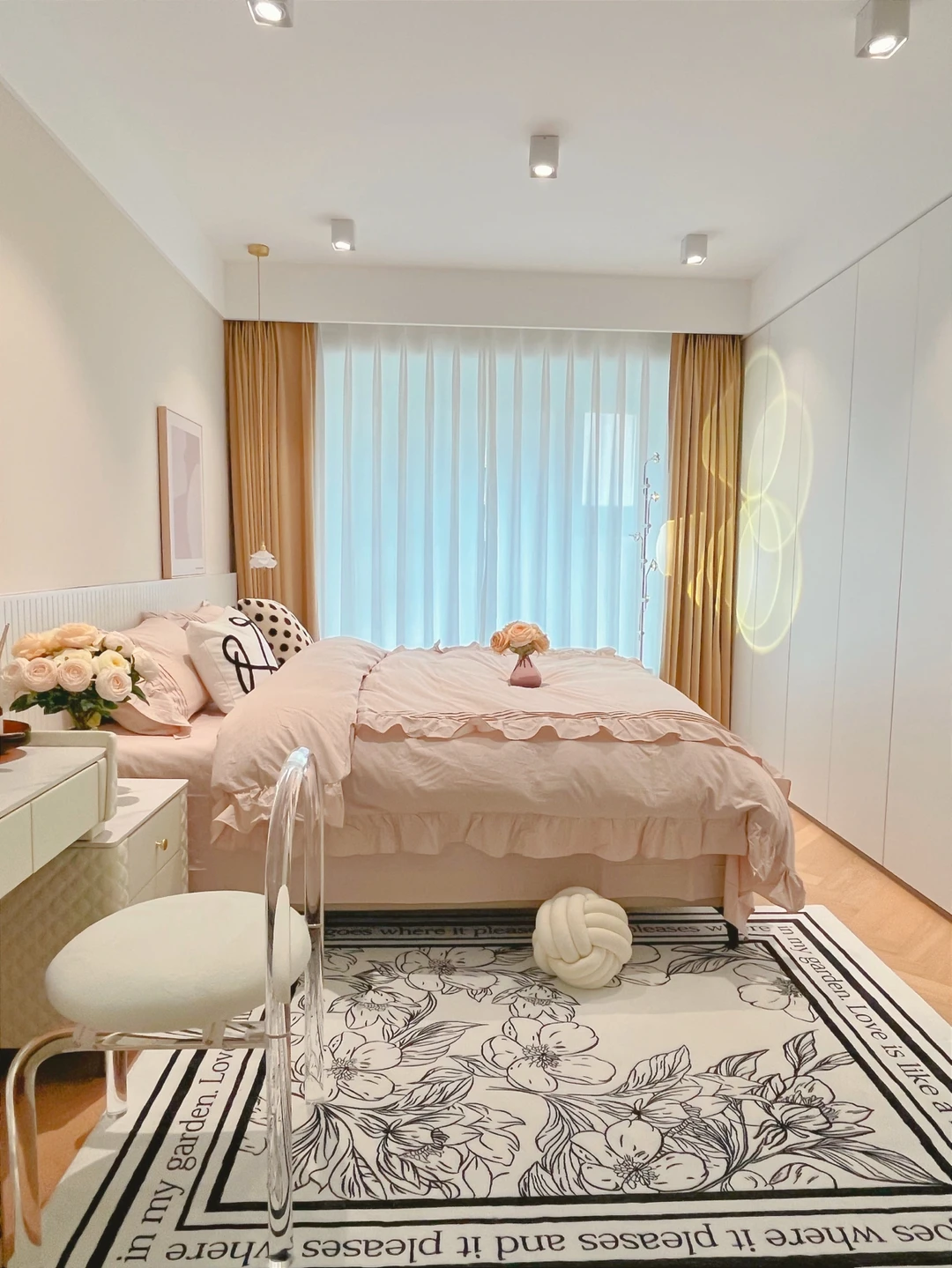 卧室整体偏奶咖色系,从窗帘到床品,妥妥的奶油风
