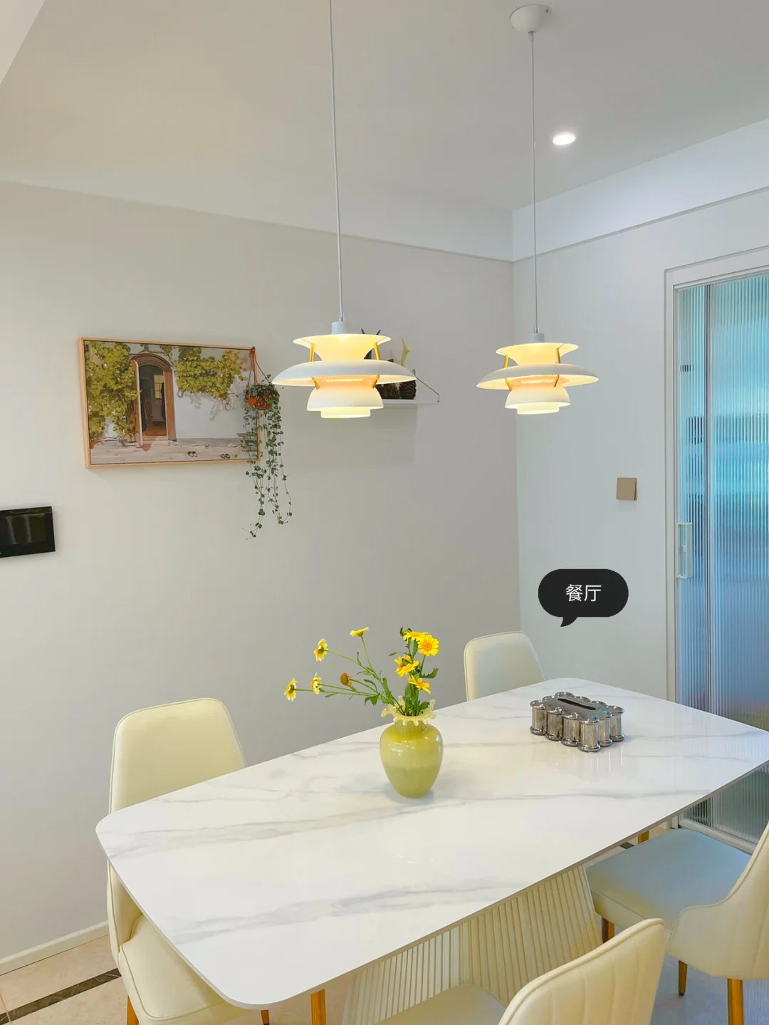 哈喽,这里是大橙的家 我家套内120平 四房改三房 客厅60平 餐厅的ph5吊灯温柔的粉白色绝绝子~ 精装房改造 装修花费约15w 真的很爱自己设计的新家啊💗