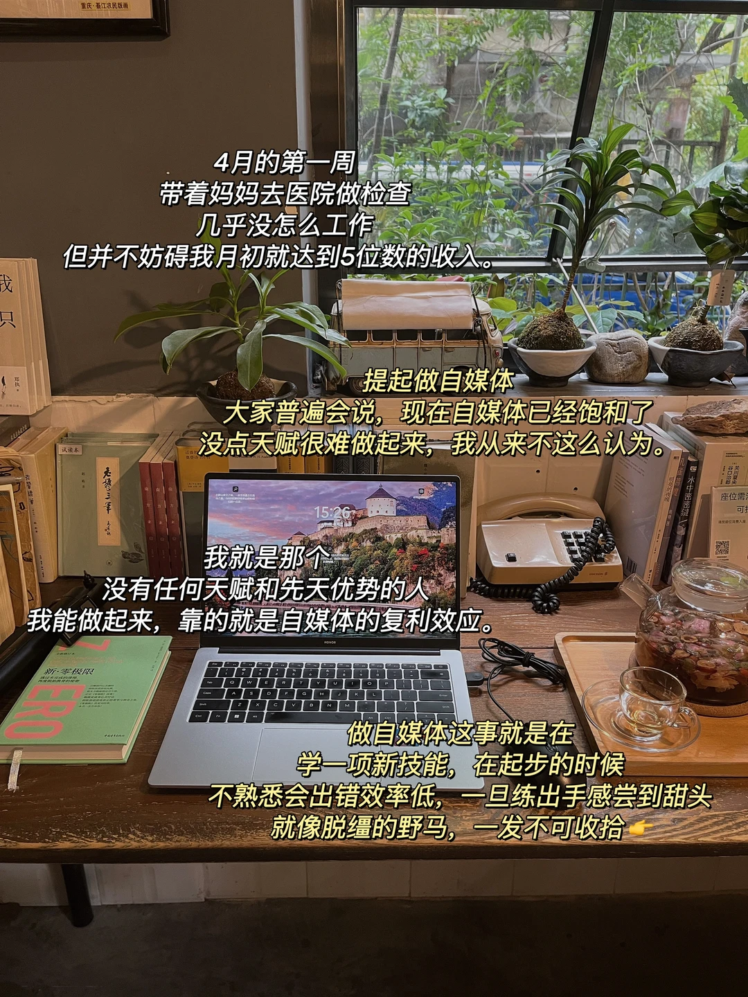 4月的第1⃣️周,带着妈妈去医院做检查,几乎没怎么工作,但并不妨碍我月初就达到5位数的收入。提起做自媒体,大家普遍会说,现在自媒体已经饱和了,没点天赋很难做起来,我从来不这么认为。