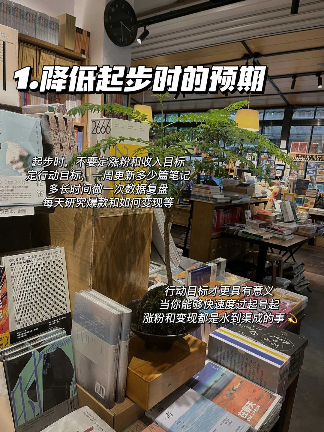 起步的时候,不要给自己定下涨粉几万变现几十万这么高的目标,保持每周按时更新,不因为数据的波动而焦虑,把更新笔记,数据复盘,研究爆款选题,研究如何变现等,这些当成每日像吃饭一样的习惯,当你过了起号期,变现就水到渠成了。