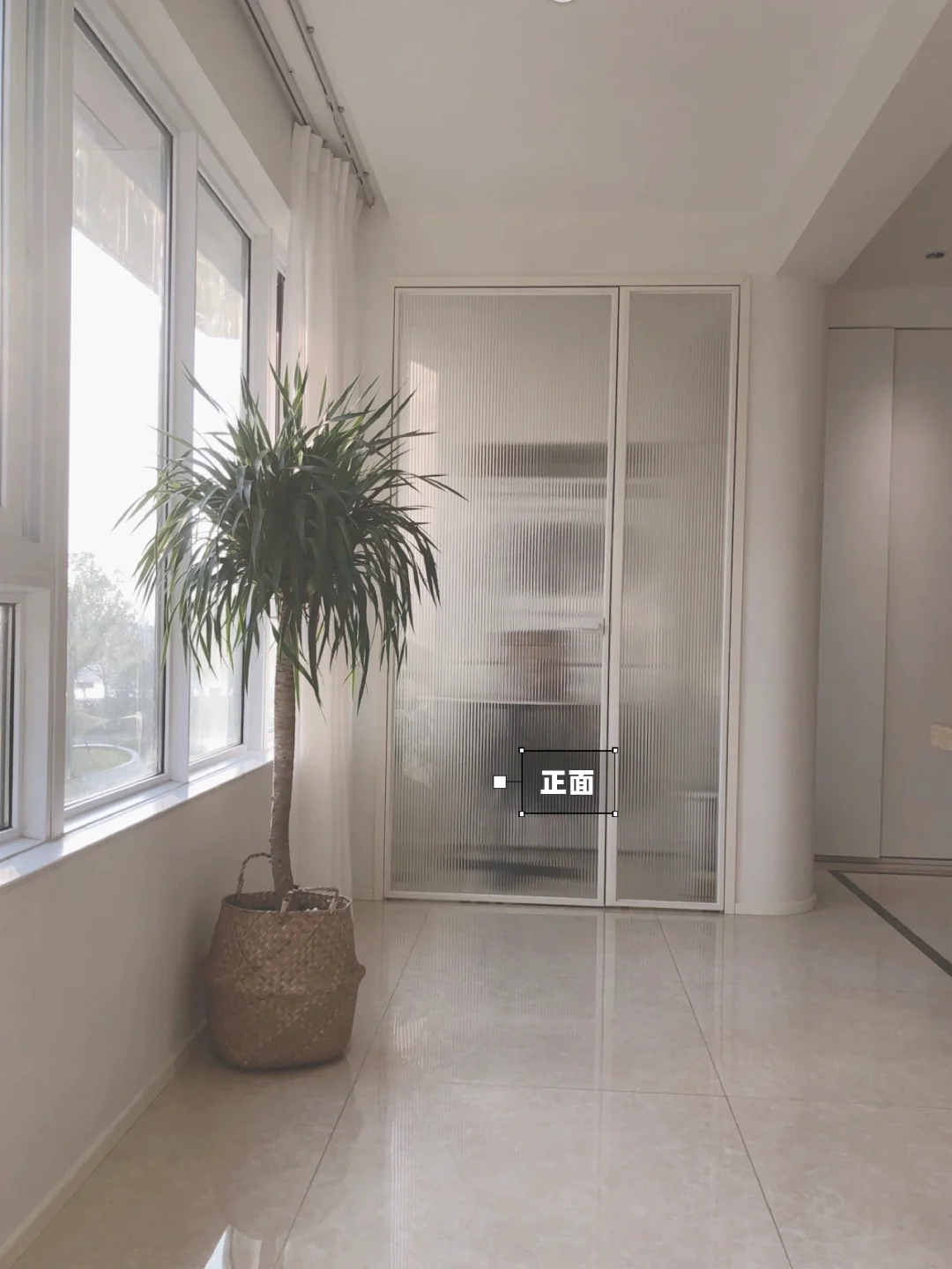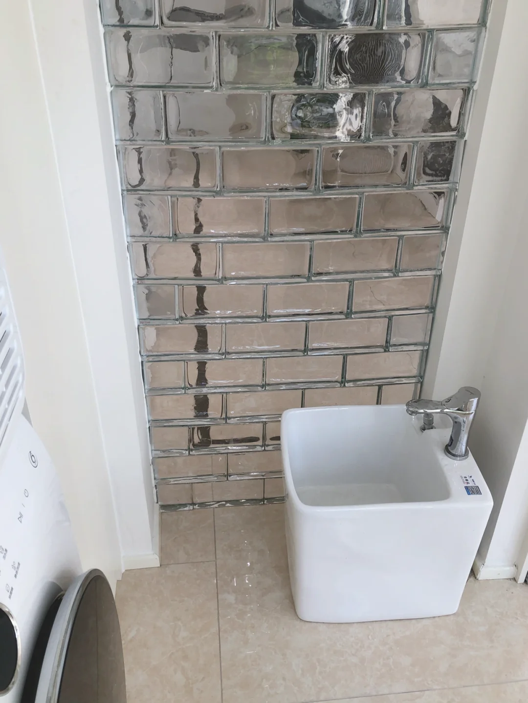 🌟所以装修阶段我在阳台隔了这样一个1平米的洗衣房,正面是长虹玻璃门,侧面是玻璃砖墙,透光的同时,阳台也更好看!麻雀虽小 五脏俱全‼️