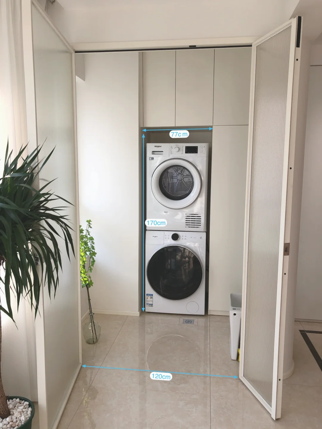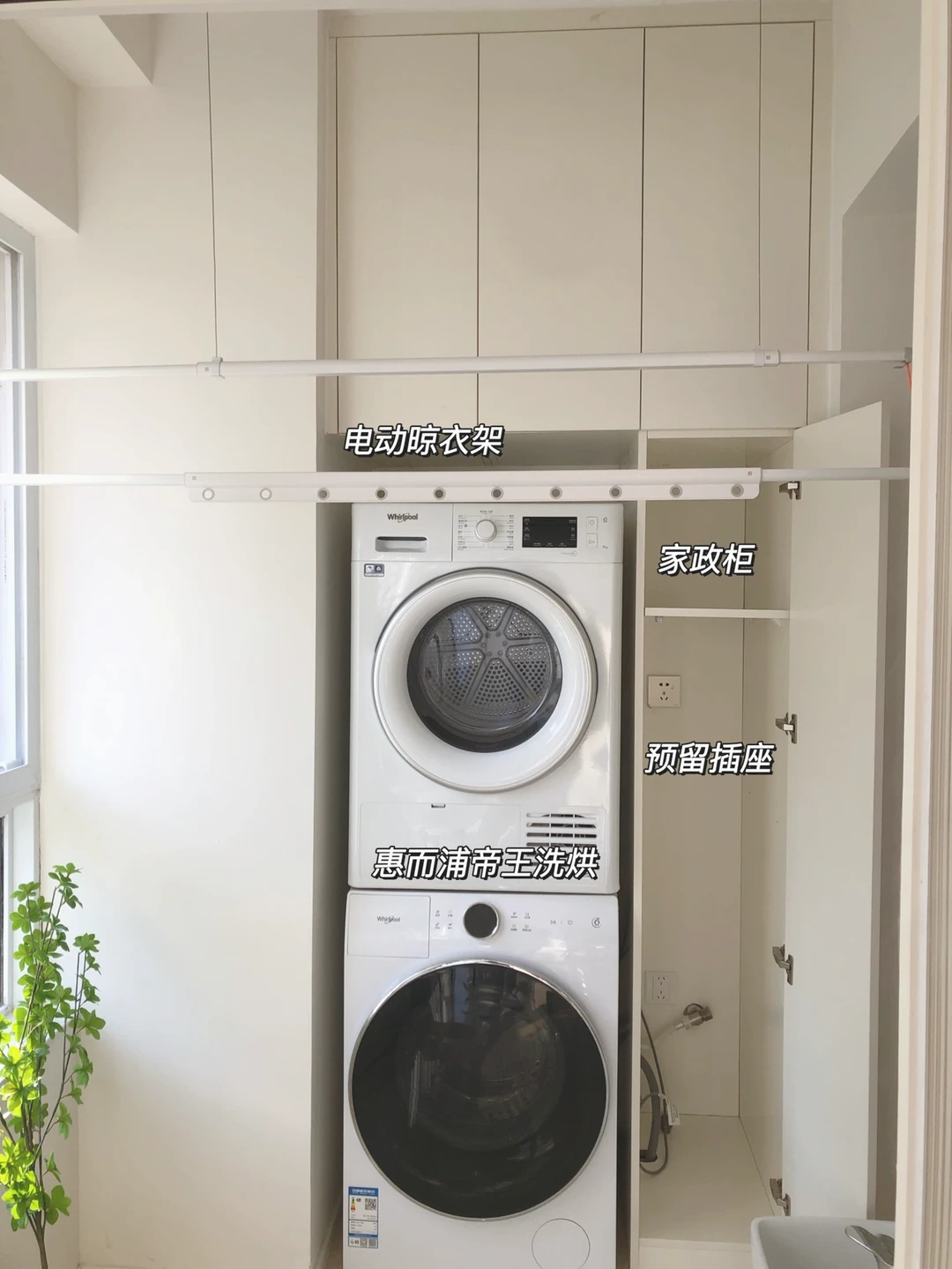 3⃣️洗衣机烘干机上下都做了柜子,❗️记得在右边柜子里预留插座,吸尘器可以直接放在里边充电。