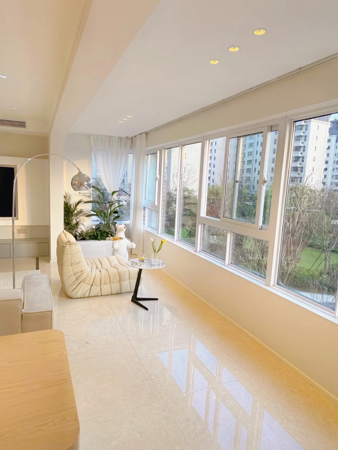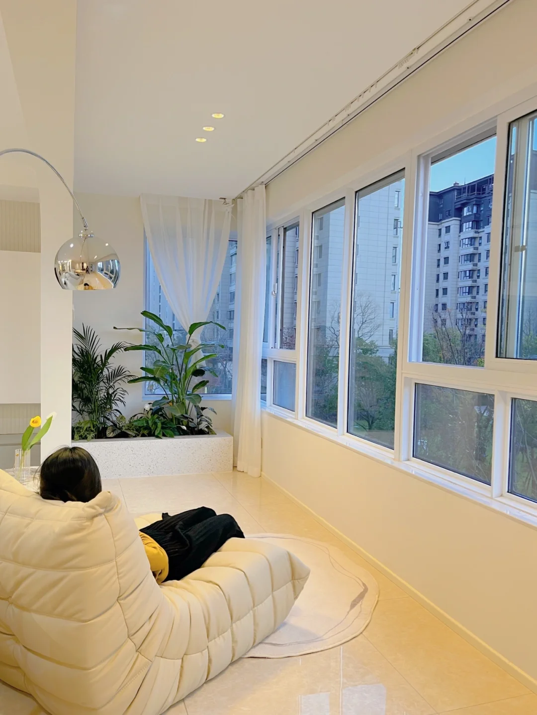 装修阶段打通了客厅和阳台! 阳台尽头砌了一个大大的花池,里面种上了满眼的绿色💚放了一个软软的沙发,懒懒的躺着真的太舒服了! 💛关于阳台花池的打造方法有兴趣的可以参考我其他笔记哟!