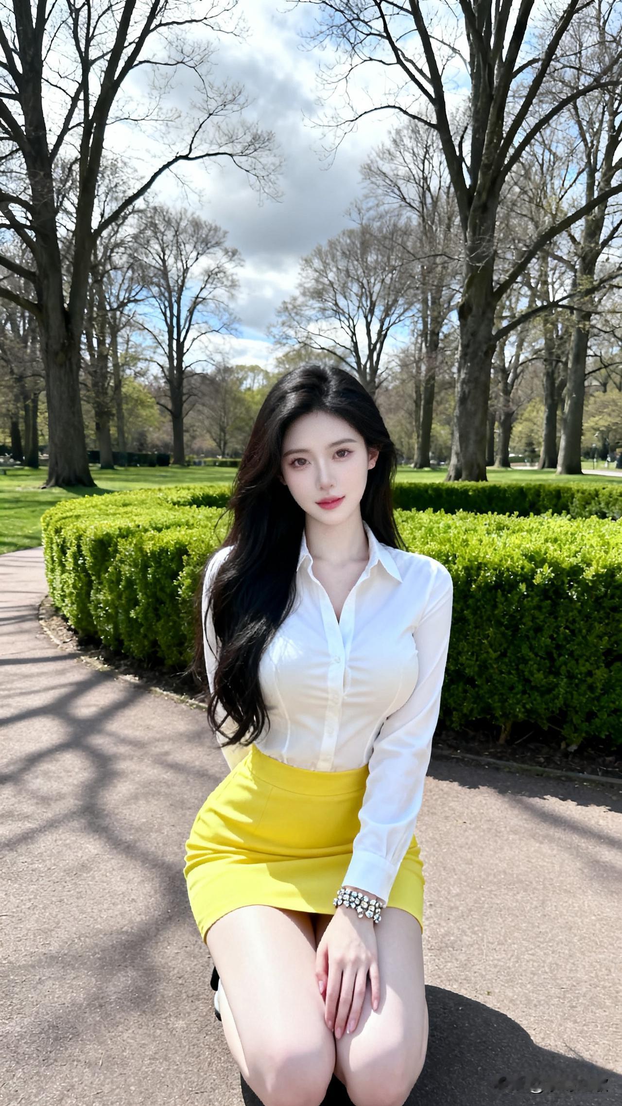 《春园倩影》 白衫飘逸映春光, 黄裙如花立中央。 绿树成荫鸟语唱, 半蹲浅笑醉芬芳。 --- 鉴赏:此诗捕捉春日园林中的优雅瞬间,白衣黄裙与绿树形成鲜明对比。诗句描绘了女性在自然中的柔美姿态,展现了春日生机与时尚魅力的完美融合。